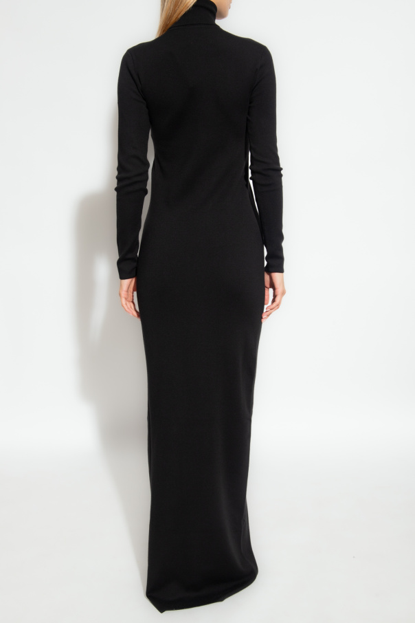 Maxi dress in black from Saint Laurent. Made from responsibly-sourced wool, this style features a snug collar, long sleeves and decorative slits on the sides.