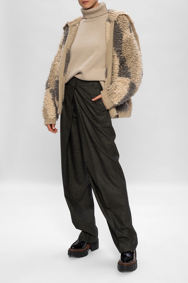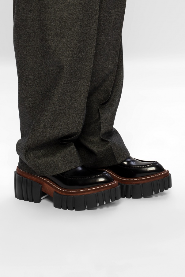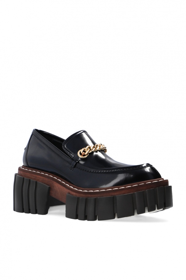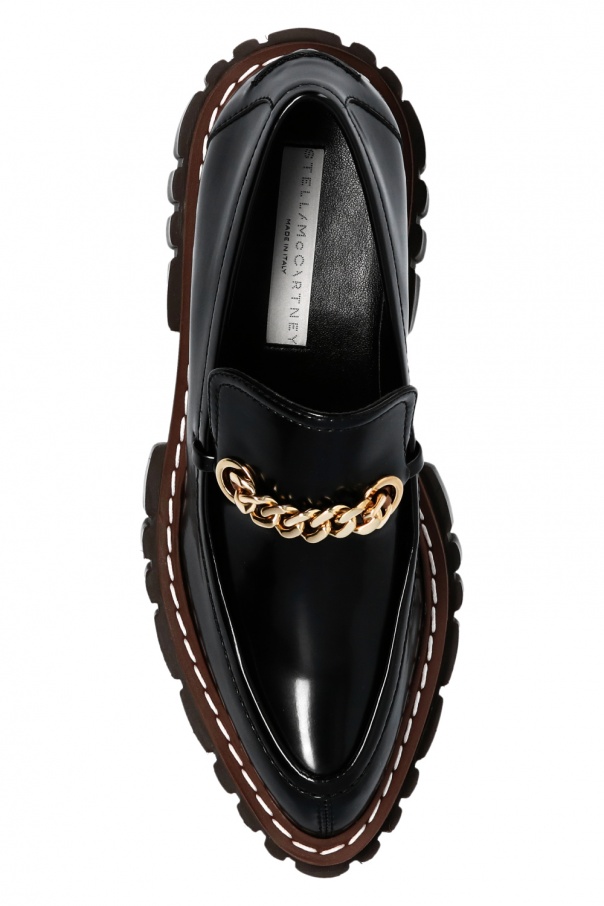 Black ‘Emilie’ platform shoes from Stella McCartney. Crafted from eco-leather, this pair is set on an exaggerated platform sole in brown rubber and showcases gold-tone chain detail.