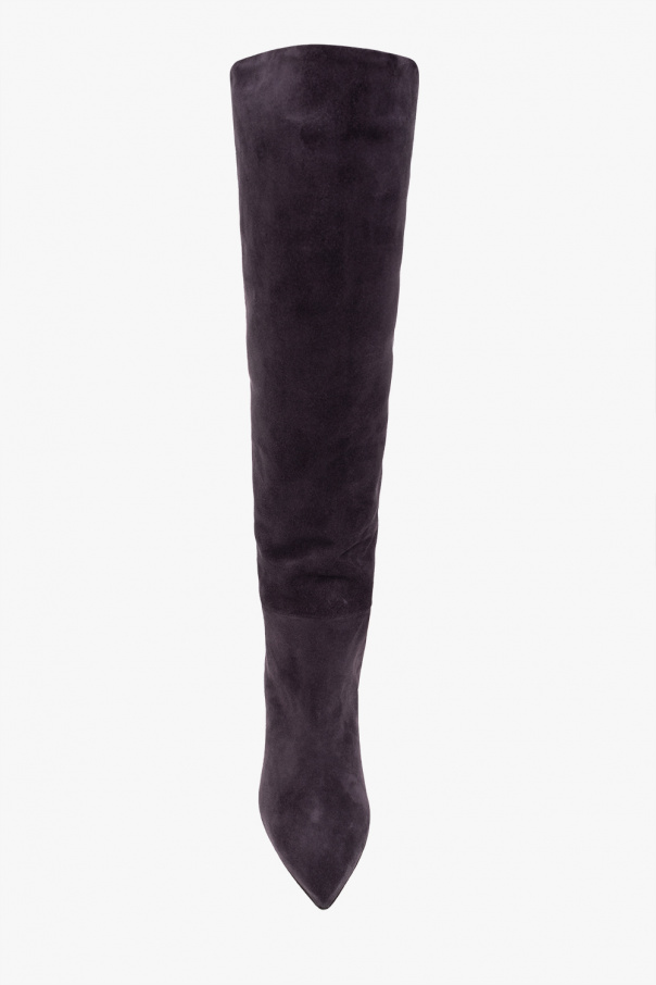 Dark purple heeled knee-high boots from Paris Texas. Crafted from suede with a slip-on silhouette, this model features a tapered toe, a cream leather sole and a high heel covered with textured leather with a crocodile skin effect.