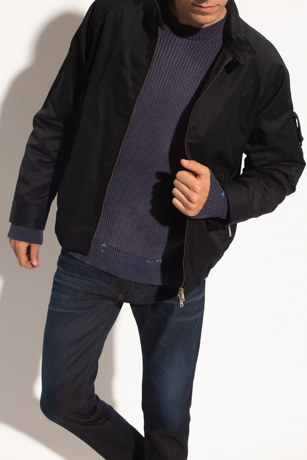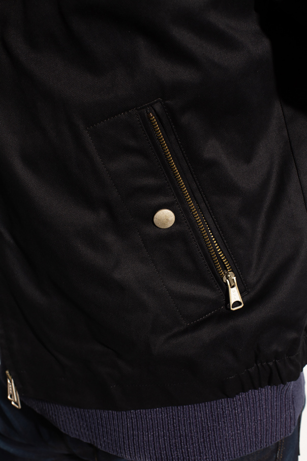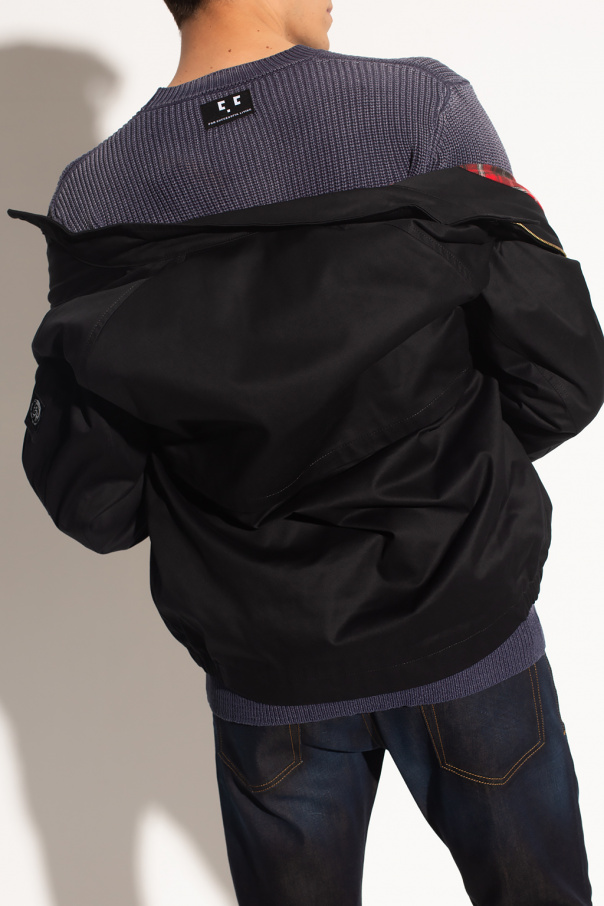 Black denim jacket from Diesel. Fastened with a two-way zip and buttons, this pair features a logo patch, two pockets fastened with zips and snaps as well as a sleeve pocket with velcro closure.