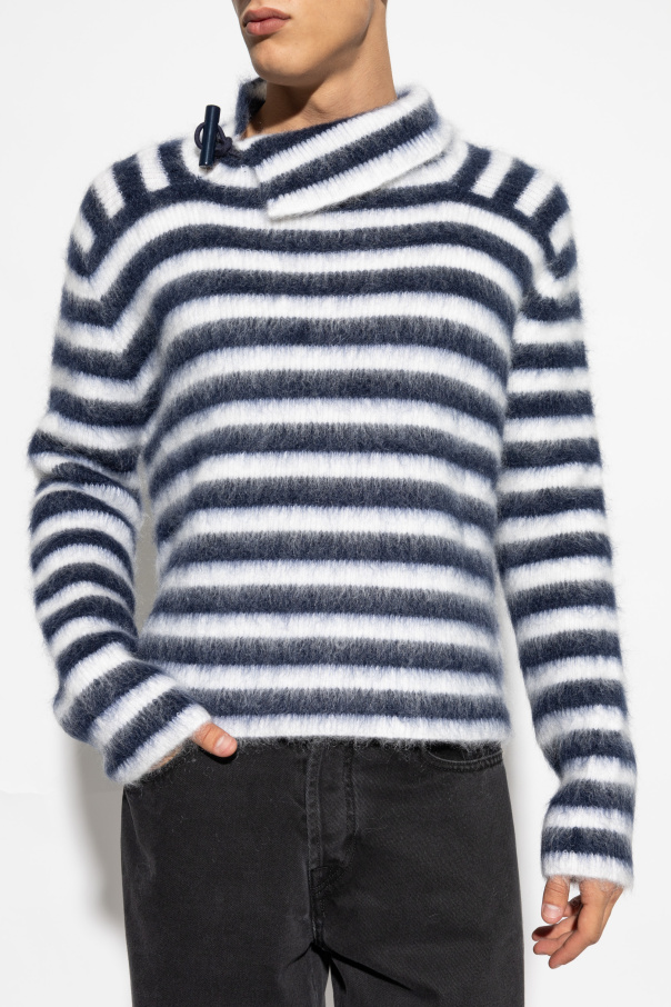 Behold the epitome of refinement with the exclusive Mohair Sweater by the illustrious designer Jacquemus. This masterpiece, woven from premium mohair, exudes a sublime softness and a delicate, plush appearance. The sweater features a timeless pattern of white and navy horizontal stripes, evoking a classic nautical charm. Its simple, slightly loose silhouette ensures unparalleled comfort, while the long, relaxed sleeves enhance its casual-chic demeanor. Notable details include a distinctive stand-up collar, gently encircling the neck and fastened with an ornate, plastic button loop. The subtle designer logo on the upper back subtly signifies its exclusive heritage. Ideal for cooler days, this versatile sweater effortlessly complements various wardrobe staples, from jeans to jackets. As depicted in the accompanying images, it pairs exquisitely with a white puffer jacket, black pants, and a black bag, showcasing its everyday styling potential. Why Choose This Product? Exquisite mohair blend for supreme softness and warmth Timeless nautical stripes for a classic look Relaxed fit for ultimate comfort Distinctive stand-up collar with ornate button detail Subtle designer logo for a touch of exclusivity