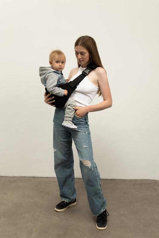 • Убедитесь, что достаточно затянули ремешок и ребенок находится «на бедре».