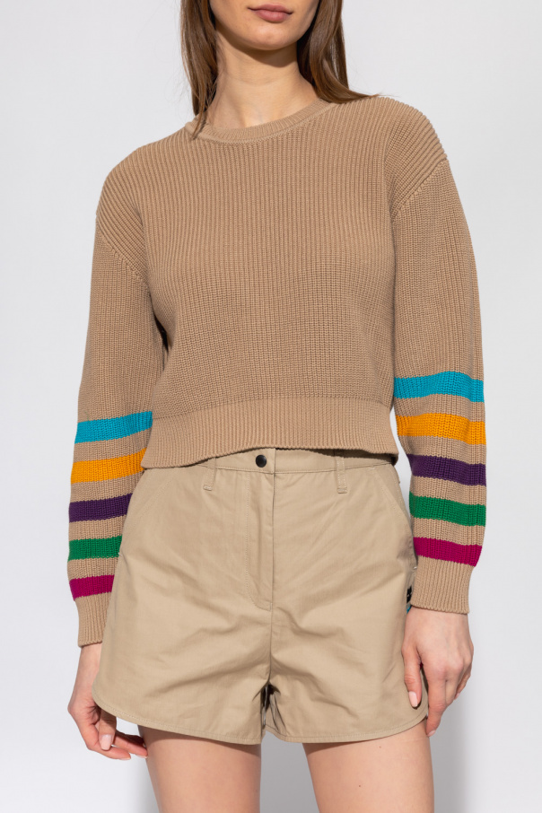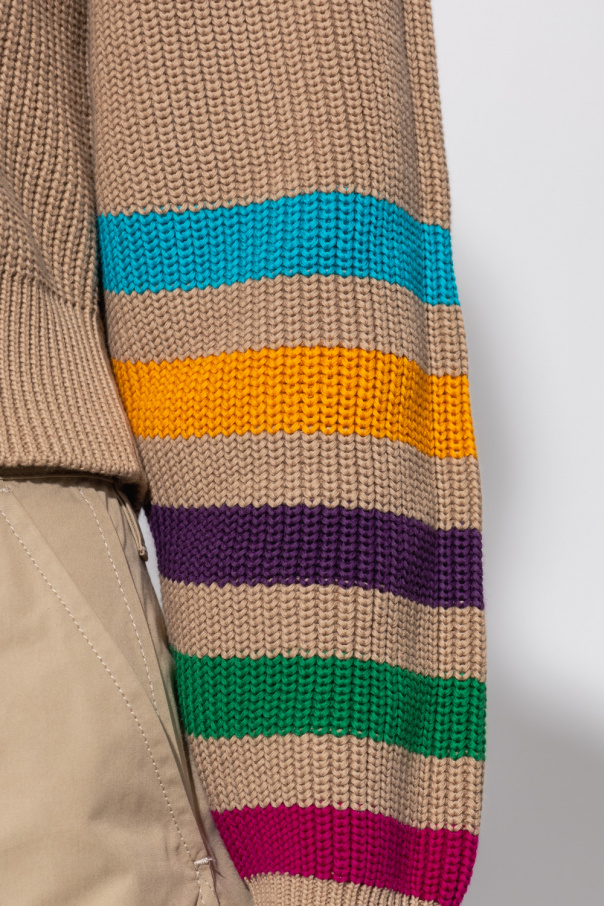 Beige crewneck sweater from Emporio Armani, the ‘Sustainability Project’ line. Made of cotton, this style features colourful stripes on the sleeves, logo embroidery at the back and ribbed trims on the collar, bottom hem and cuffs. The ‘Sustainability Project’ line uses recycled materials.