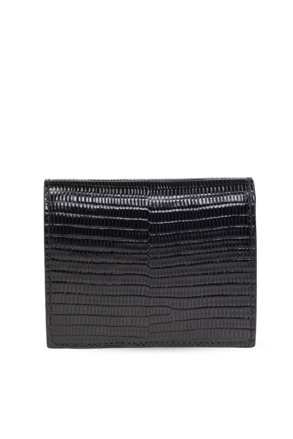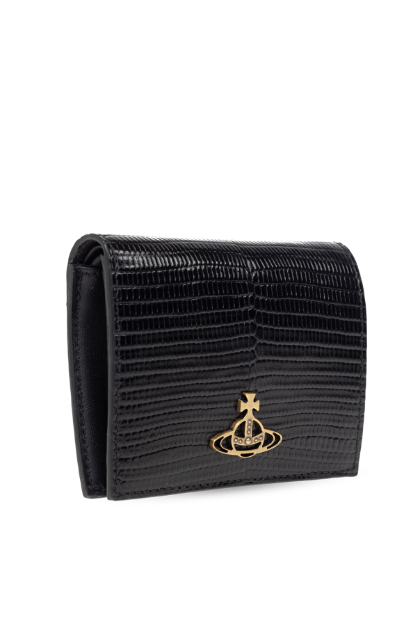 Black wallet from Vivienne Westwood. Crafted from leather with a snakeskin effect, this model features a snap closure, metal logo detail in gold-tone as well as one bill compartment, one snap-fastened coin pocket, two slip pockets and three card slots.