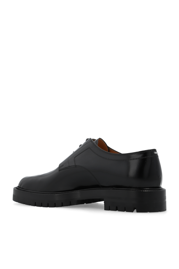 Black Derby shoes from Maison Margiela. Made of smooth patent leather, this lace-up model sits on a black rubber sole and showcases the iconic ‘Tabi’ split toe.