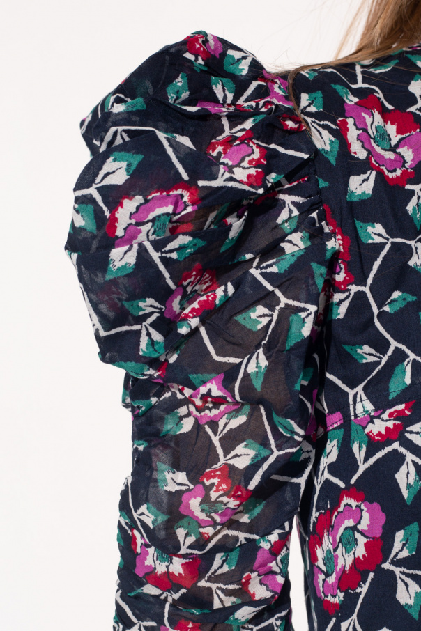 Navy ‘Sichelle’ dress from Isabel Marant Étoile. Fastened with a back zip and drawstrings, this model features a multicolored floral pattern, fitted waist, decorative cut-out back, flared skirt with a ruffle and ruched puff sleeves with gathers.