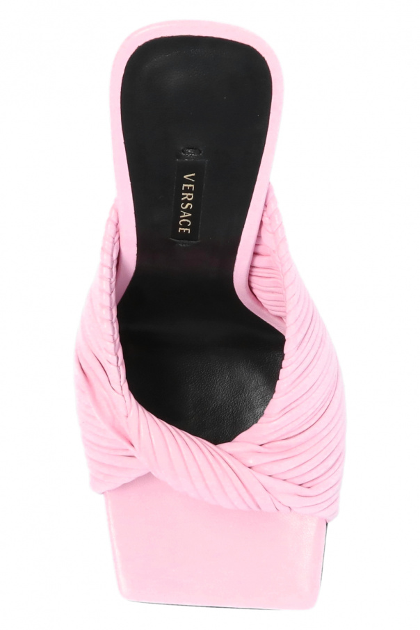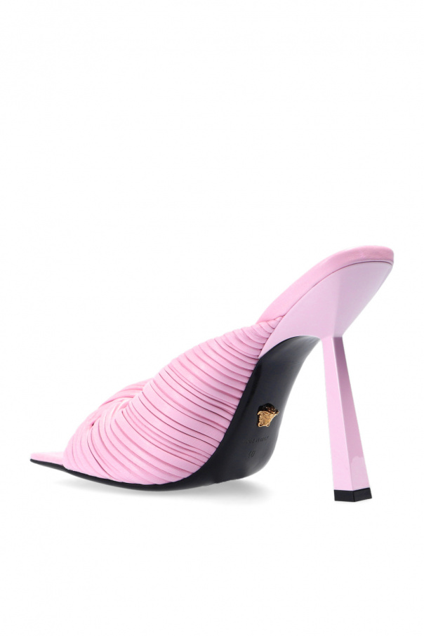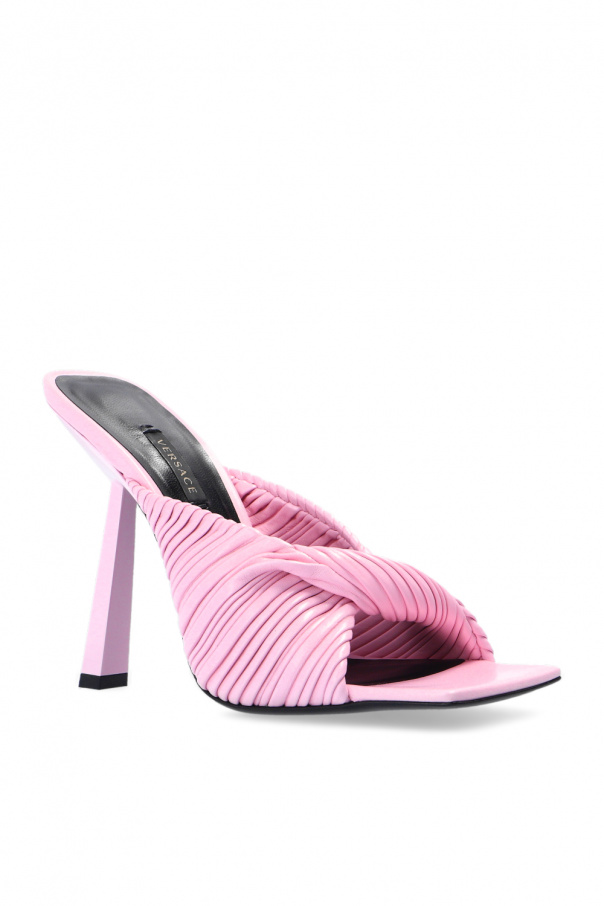 Pink pleated stiletto mules from Versace. Made of leather, this pair is set on a black leather sole.