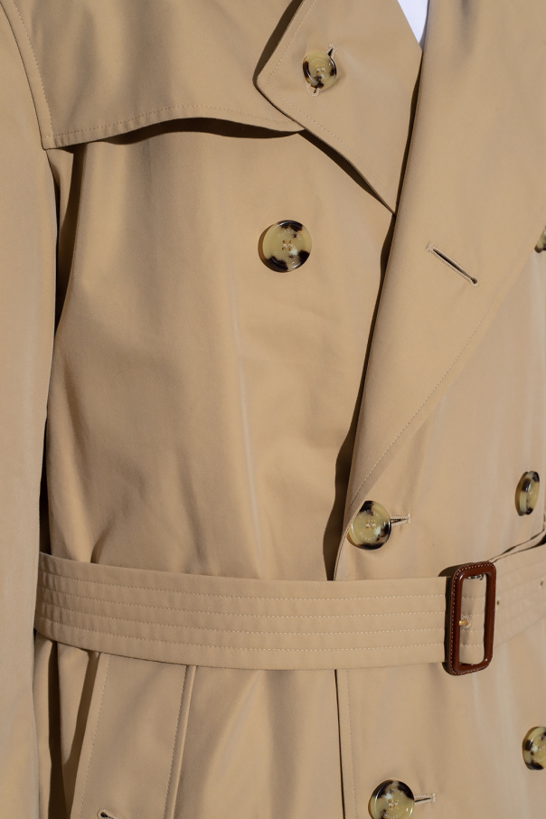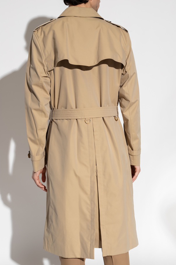 Beige ‘Kensington Long’ double-breasted trench coat from Burberry. Made of cotton, this garment features button fastenings, buckle belt, epaulette details, two buttoned front pockets, long sleeves, single rear vent and lining with the brand’s signature multicolored check pattern.