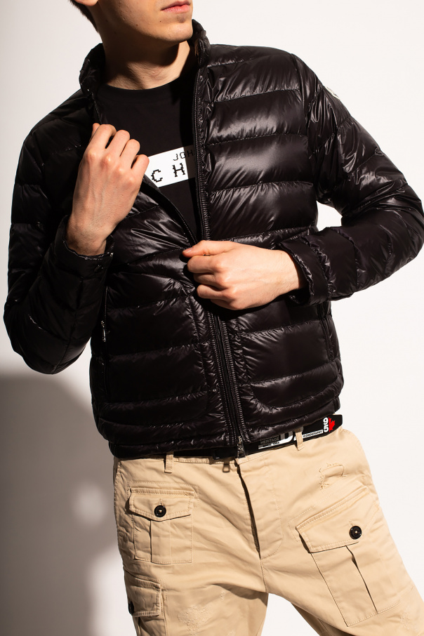 Black ‘Acorus’ quilted jacket from Moncler. Fastened with a two-way zip and snaps, this design features a cream, navy and red logo patch and two front zip pockets.
