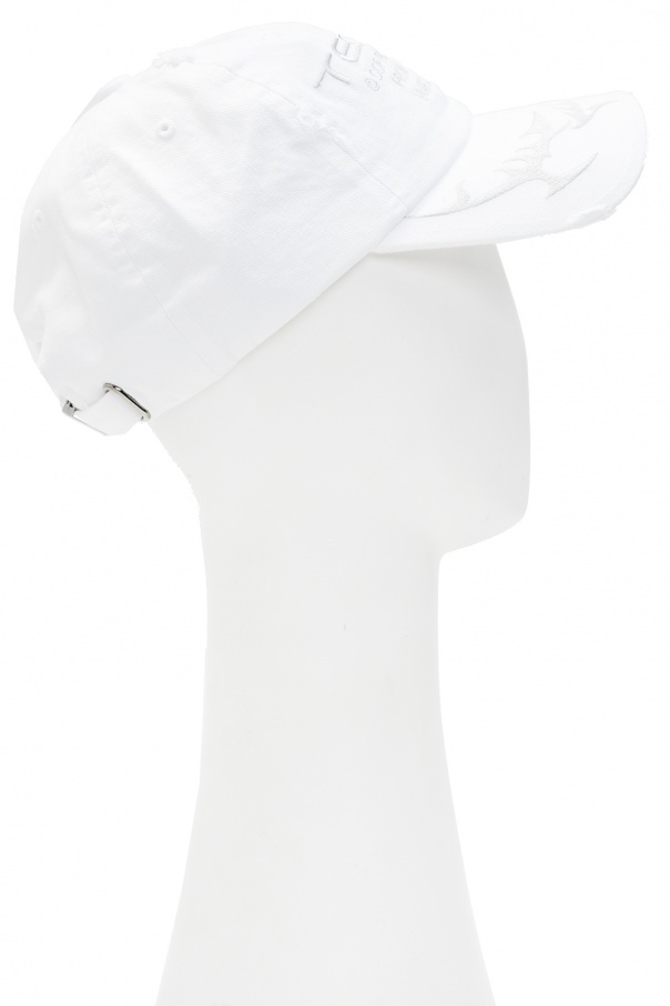 White ‘Tecno’ baseball cap from MISBHV. Crafted from cotton, this design features embroidered logo lettering in silver-tone and a buckle strap at the back.