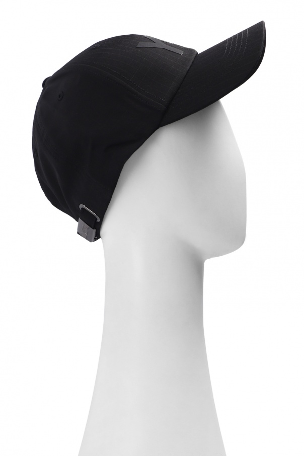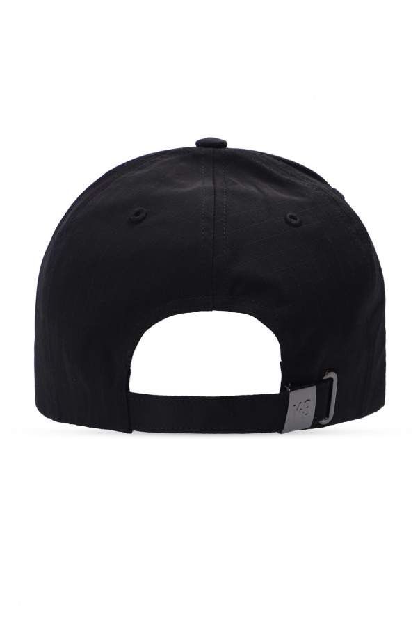 Black baseball cap from Y-3 Yohji Yamamoto. Crafted from cotton and viscose blend, this piece of headwear comes printed with the brand's logo in green. Offering an adjustable fit, it is complete with a silver-tone buckle strap on the back.