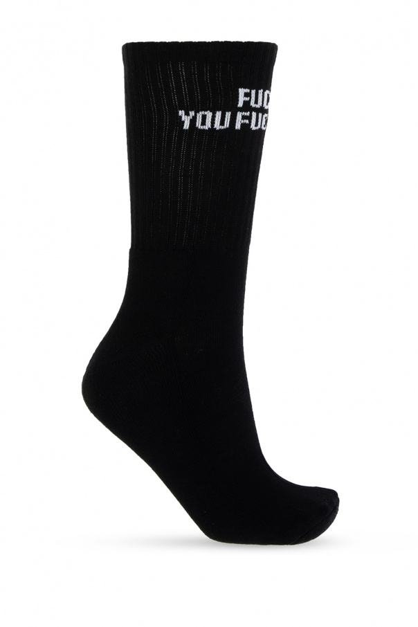 Black socks from R13. Made of cotton, this pair features a white graphic motif and ribbed cuffs.