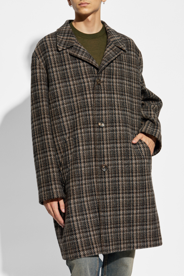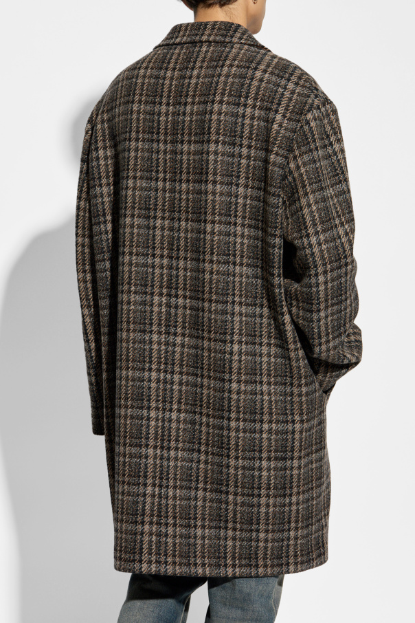 Introducing the Checkered Coat from the esteemed fashion house Etro. This men's coat is a testament to refined craftsmanship and sartorial elegance. Featuring a classic straight cut with subtly dropped shoulders, it exudes a slightly oversized silhouette that is both contemporary and timeless. The coat showcases a distinctive checkered pattern in hues of gray, brown, and black, meticulously rendered in a luxurious wool-cashmere blend. The high-quality, thick fabric ensures warmth and comfort, making it an ideal choice for colder days. Elegantly adorned with large gray buttons, a classic lapel collar, and two slightly recessed side pockets, this coat strikes the perfect balance between sophistication and practicality. Inside, the coat is lined with a striped viscose-acetate blend, adding a touch of opulence to its interior. The coat's length extends to mid-thigh, providing additional protection against the chill, while its versatile design makes it suitable for both casual and formal occasions. Why Choose This Product? Exquisite checkered pattern in gray, brown, and black. High-quality wool-cashmere blend for superior warmth and comfort. Elegant detailing with large gray buttons and a classic lapel collar. Versatile design perfect for various styling options. Luxurious striped lining for added elegance.