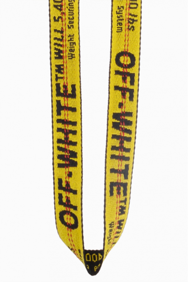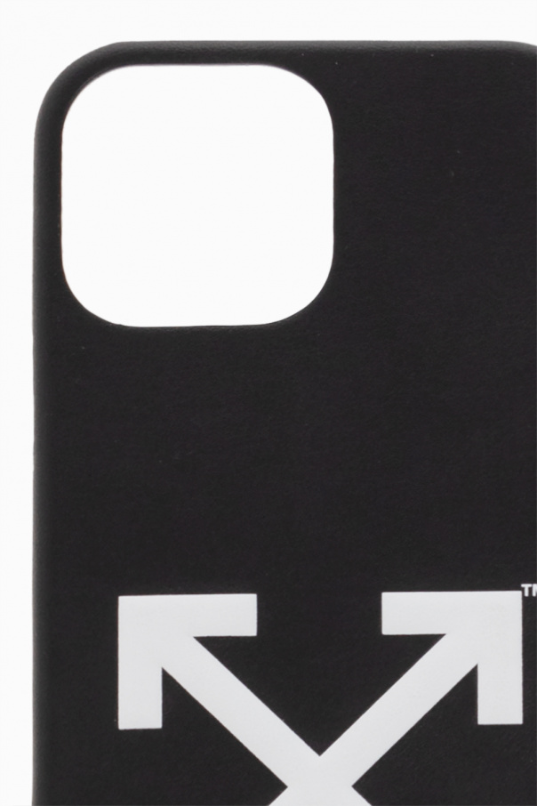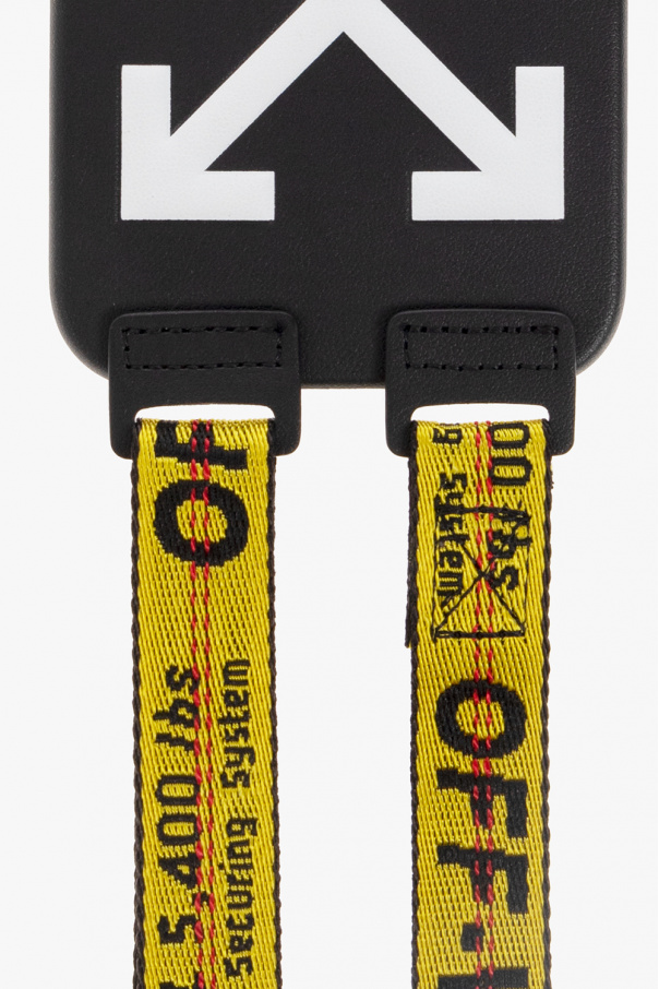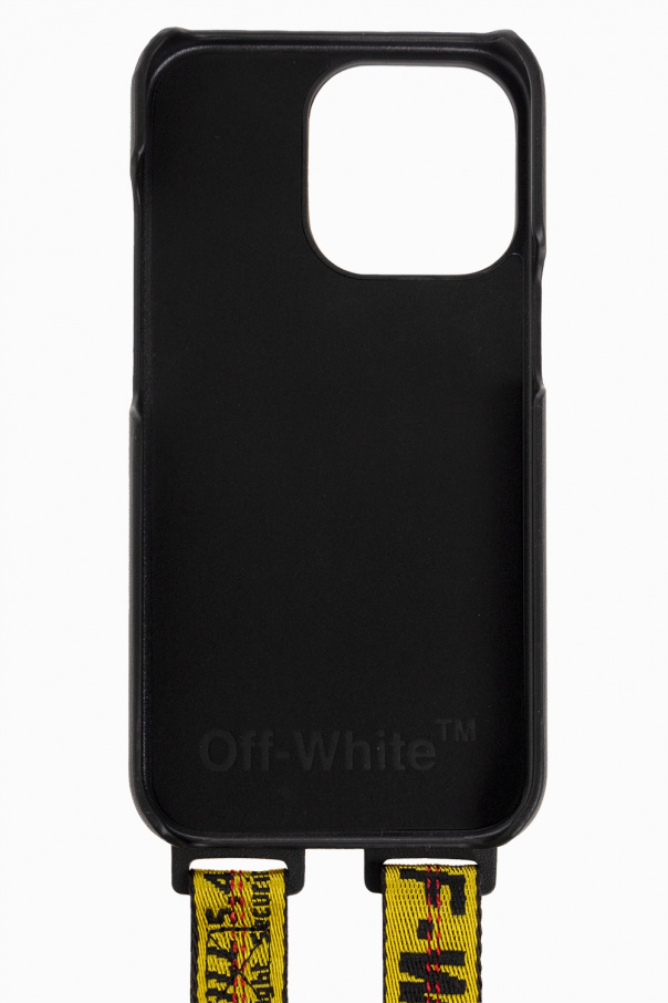 Black iPhone 13 Pro Max case from Off-White. Emblazoned with a tactile white logo at the back, this item features a yellow and black adjustable jacquard strap with the brand's logo and red stitching details.