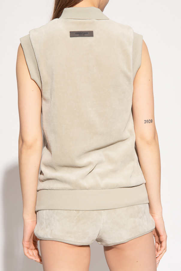 Greyish green sleeveless polo shirt with a velour finish from FEAR OF GOD ESSENTIALS. This garment is complete with a button collar and rubber logo patch.