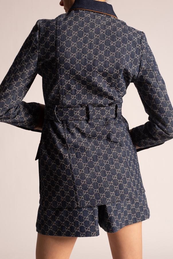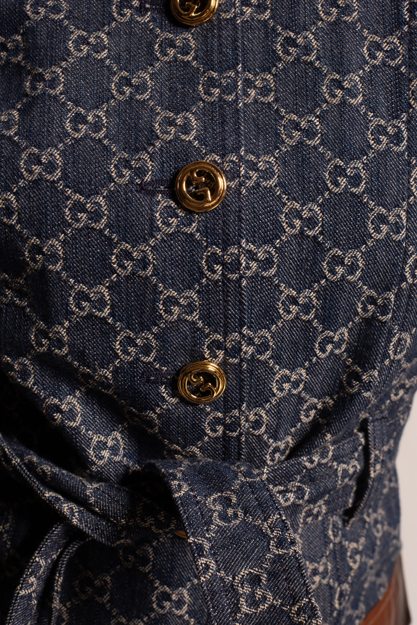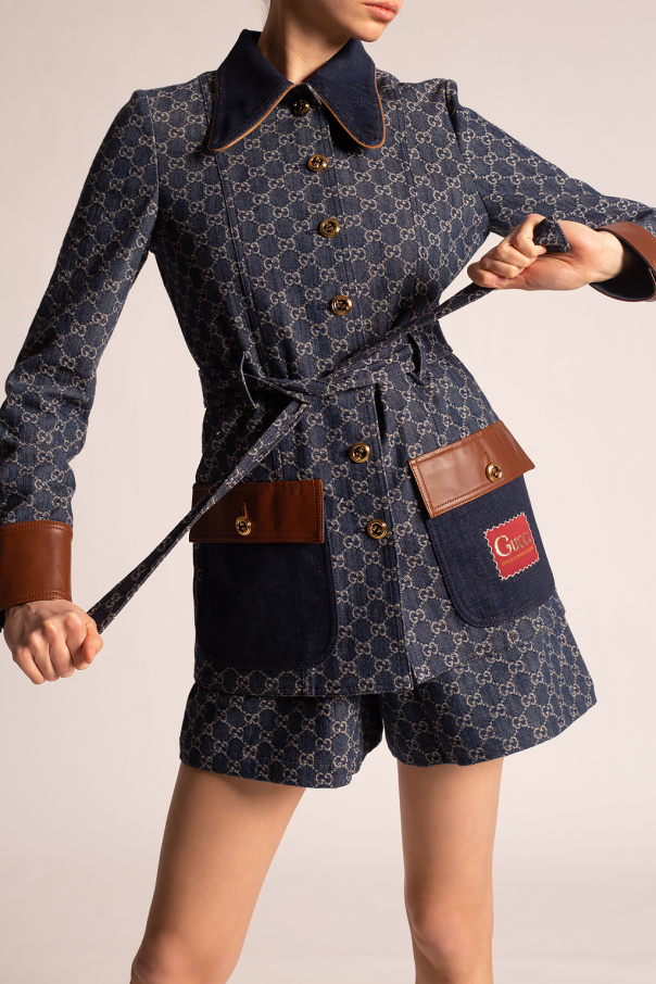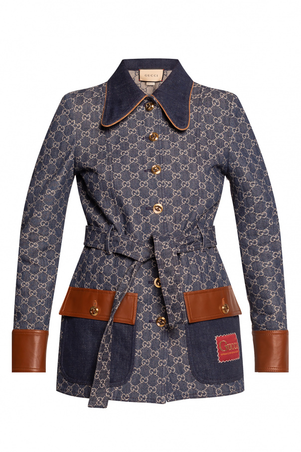 Navy denim coat from Gucci, ‘Epilogue’ collection. Crafted from organic cotton with brown lamb leather trims, this design is complete with metal logo buttons in gold-tone, a beige monogram, two flap pockets, maroon patch embroidered with a gold-tone logo as well as a belt at the waist.