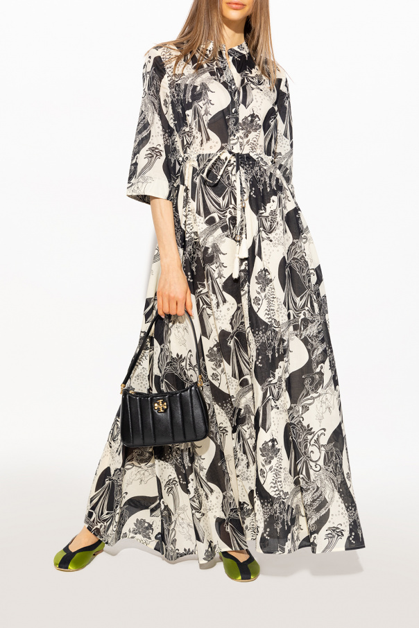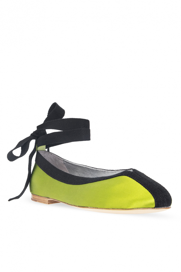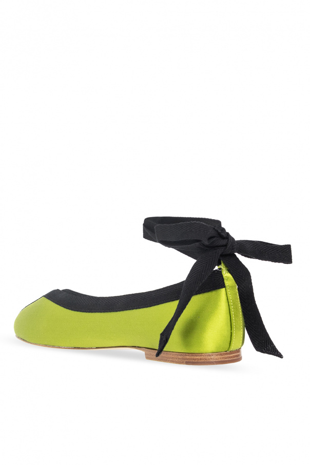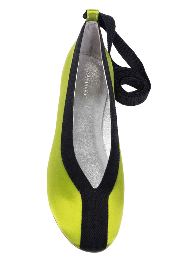 Green ‘Herringbone’ satin ballet flats from Tory Burch. Accentuated with a black ribbon tied at the ankle, this model features metallic silver-tone leather lining and a beige and brown leather sole.
