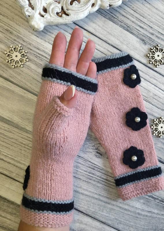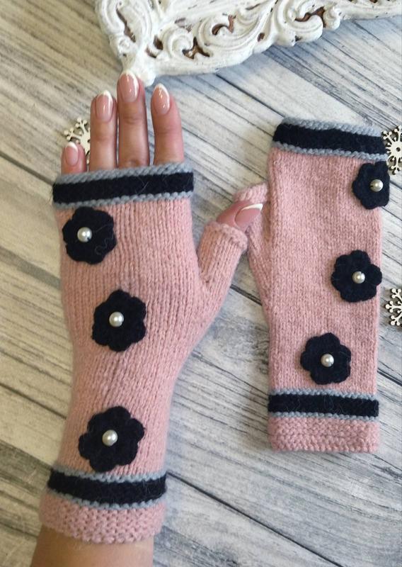 Эти вязаные митенки из нежной пепельно-розовой пряжи и цветочным декором добавят романтичности и женственности любому образу.
