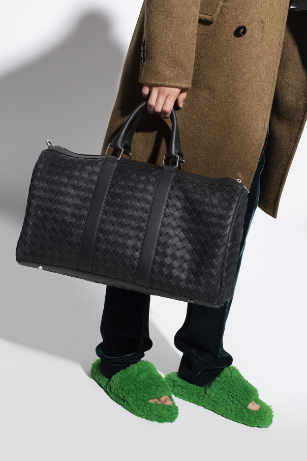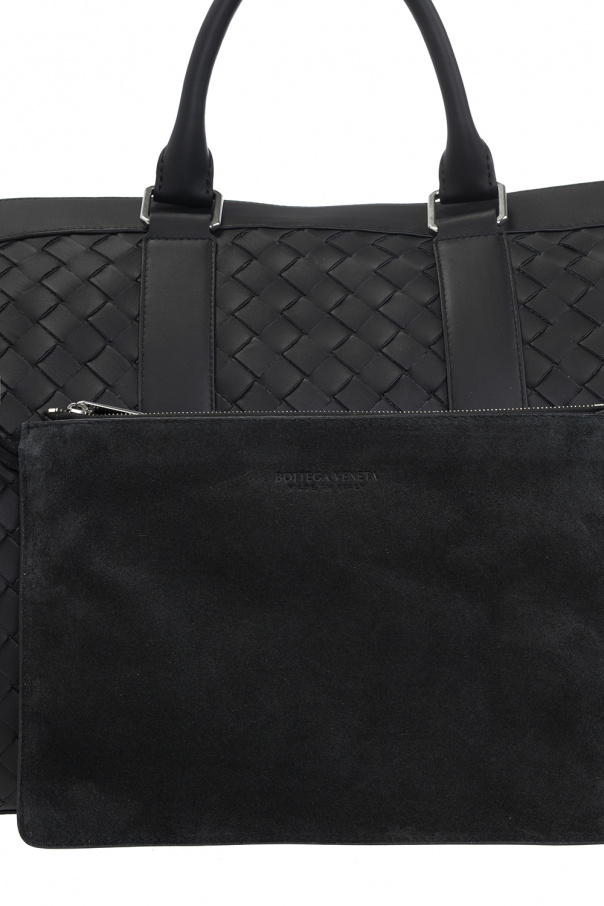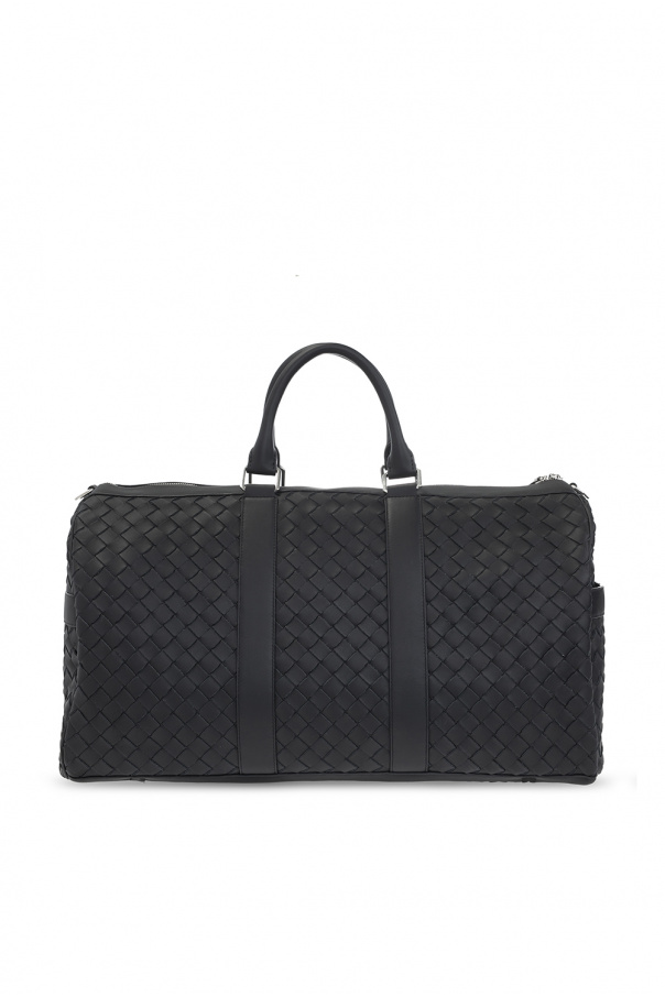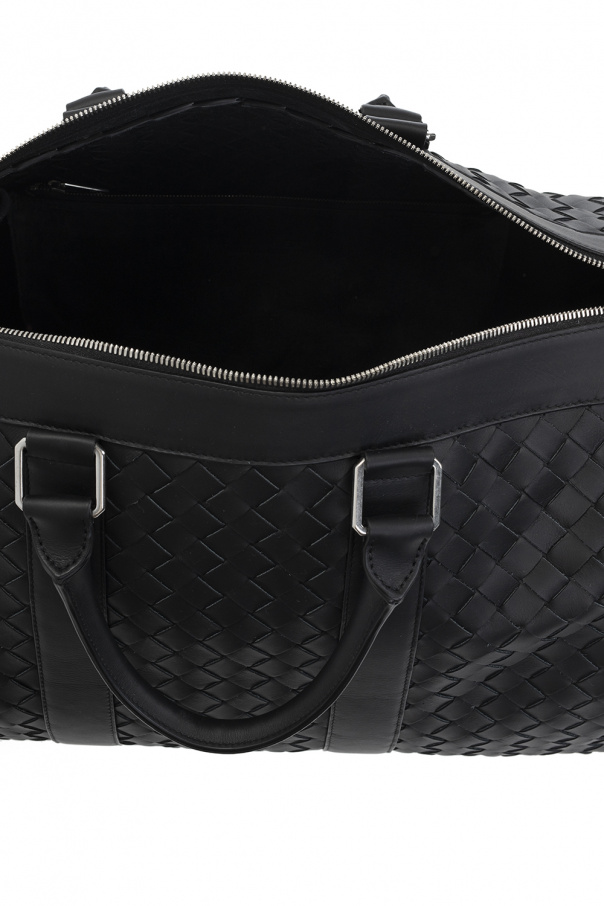 Black ‘Classic Hidrology’ duffel bag from Bottega Veneta. Crafted from calf leather with the brand's iconic Intrecciato weave, this design fastens via a two-way zip and features a zip pocket on the side, two half-round handles, a detachable and adjustable strap, silver-tone metal hardware and one internal compartment.