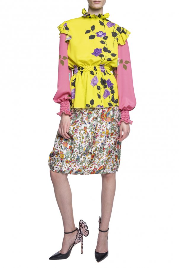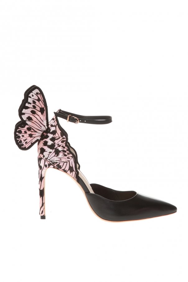 Black ‘Chiara’ pumps from Sophia Webster. Made of leather. Fastened via buckle strap around the ankle. Feature pointed toe, embroidered colourful wings on the rear and beige leather sole.