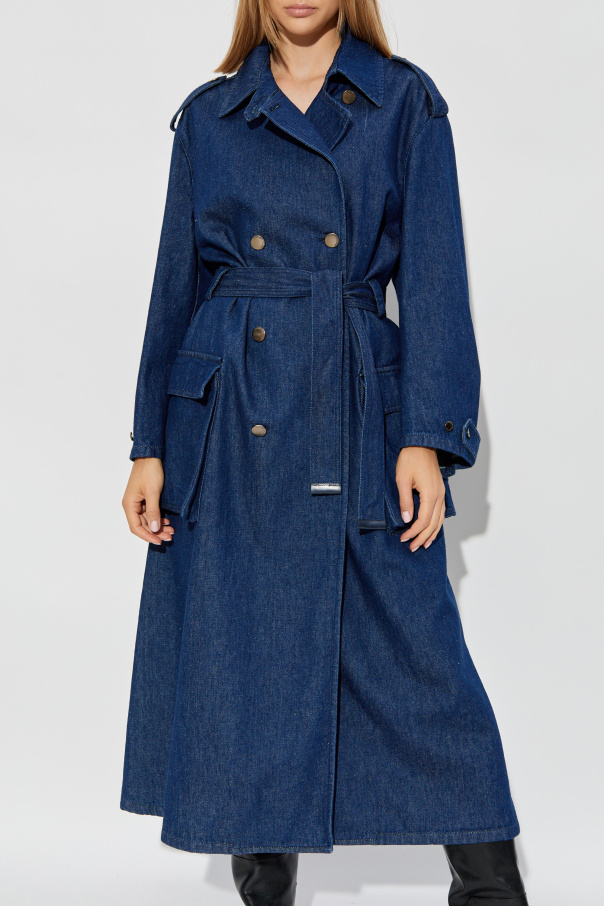 Presenting the Denim Trench Coat by the illustrious fashion house Emporio Armani. This opulent piece is meticulously crafted from premium denim, radiating a deep navy hue that epitomizes timeless elegance. Designed with a classic trench silhouette, it extends gracefully to the ankles, accentuated by a wide waist belt that enhances the feminine form. The double-breasted closure, adorned with golden buttons, bestows an air of sophistication, while the traditional trench collar with lapels adds a touch of refinement. Functional yet chic, the coat features large, flap-topped patch pockets at the hips, and long sleeves finished with buttoned cuffs. Distinctive shoulder epaulets infuse a subtle military charm, and the rear belt, emblazoned with the Emporio Armani logo, underscores its exclusive lineage. This denim trench is showcased with black low-heeled shoes and a matching handbag, emphasizing its fashionable and versatile nature. Classified under women’s clothing, coats, and trench coats, it is perfect for both casual outings and more formal occasions. Why Buy This Product? Expertly crafted from 100% cotton denim. Classic, ankle-length trench silhouette with a timeless appeal. Golden double-breasted buttons for an elegant finish. Functional design with large patch pockets and buttoned cuffs. Exclusive Emporio Armani logo detailing for a touch of luxury.