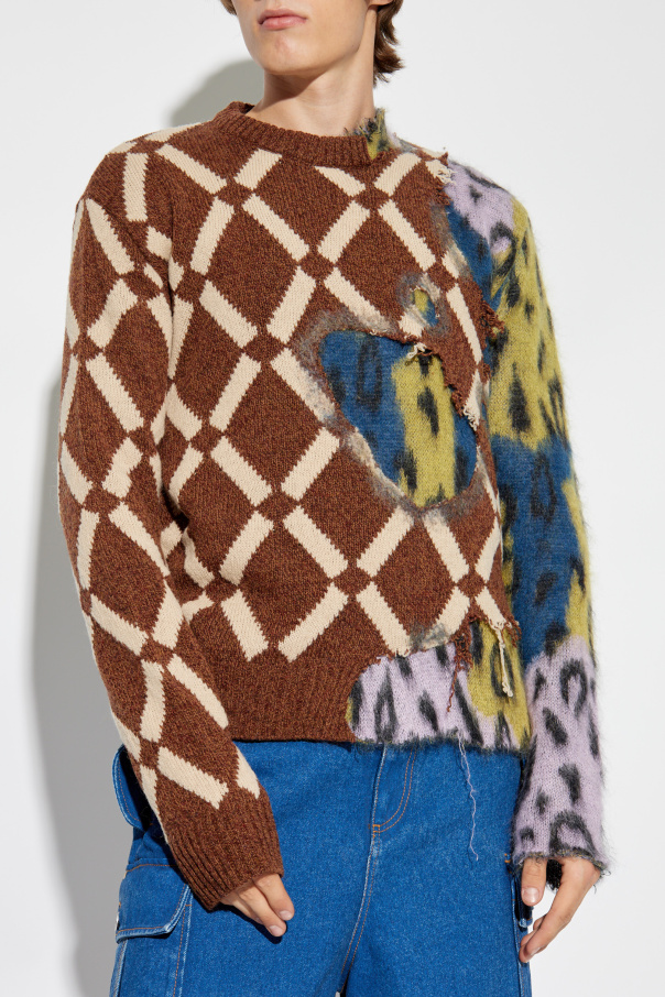 Introducing the Vintage Effect Sweater from the illustrious Italian brand Marni. This exquisite piece is a testament to the brand’s commitment to combining classic elegance with modern artistry. Crafted from soft, thick wool, the sweater features a classic, straight cut with long sleeves and a round neckline. The intricate design showcases a geometric check pattern in shades of brown and beige, interspersed with contrasting elements in blue, yellow, green, and purple, creating a captivating vintage effect. The vintage effect is further accentuated by intentional distressing and strategically placed holes, lending the sweater a unique, artistic character. The close-up images reveal the plush, substantial texture of the material, highlighting the meticulous craftsmanship involved in its creation. Pair this multicolored piece with wide-leg blue jeans and a dark green coat to emphasize its fashionable and unique appeal. The detailed finishings on the distressed areas suggest a thoughtfully designed piece, reflecting Marni's renowned attention to detail and distinctive aesthetic. Why buy this product? Expertly crafted from 100% wool for unparalleled softness and warmth. Unique vintage effect with artistic distressing and vibrant color accents. Classic cut that seamlessly blends timeless style with contemporary flair. Designed by the iconic Marni, known for its eclectic and bold designs. Perfect for making a stylish statement with any outfit.