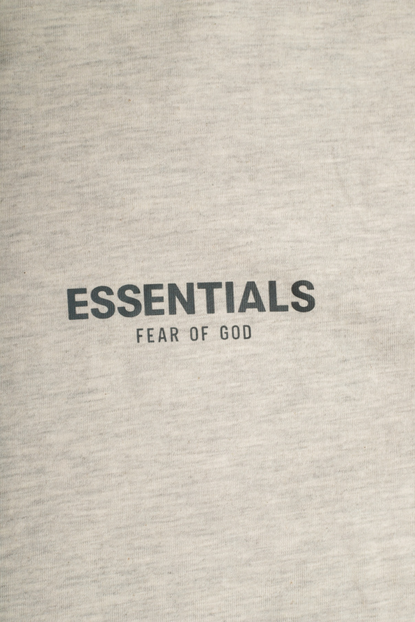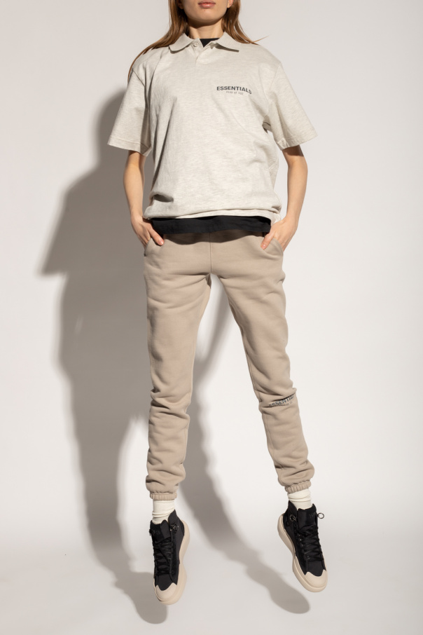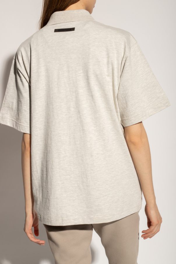 Grey and cream polo shirt from Fear Of God Essentials. Made of cotton, this style features short sleeves, a button placket and a dark grey graphic print with the brand's logo.