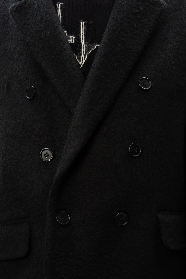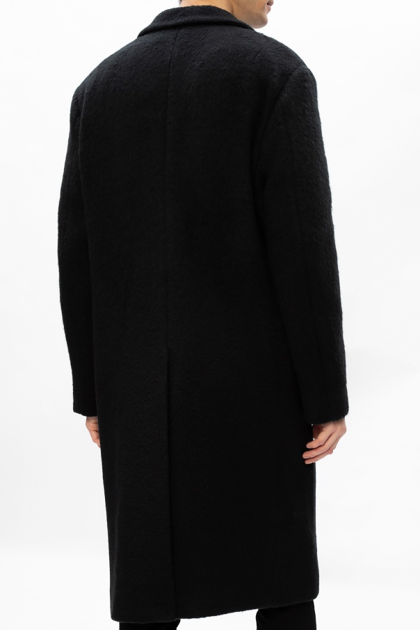 Black 'Campo' coat from AllSaints. Boasting a double-breasted silhouette, this wool-crafted piece of outerwear fastens via buttons and employs notched lapels, two flapped pockets on the front and single vent on the back.