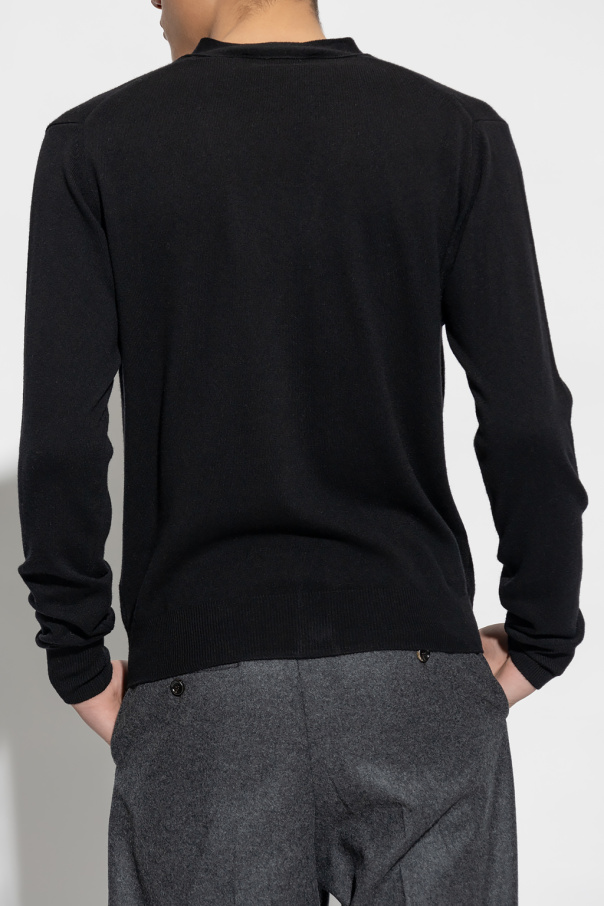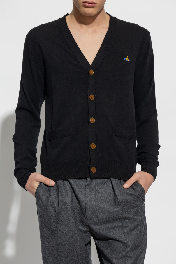 Black cardigan from Vivienne Westwood. Crafted from a wool and cashmere blend, this design features a multicolored embroidered logo pattern, two slip pockets and ribbed trims at the V-neck, hem and cuffs.