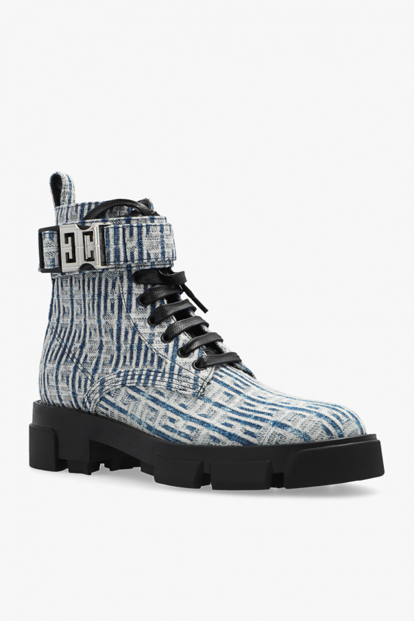Blue and cream 'Terra' heeled ankle boots from Givenchy. Embellished with a monogram pattern, this lace-up model sits on a black rubber sole and features a side zipper and an ankle strap with a silver-tone 4G buckle.