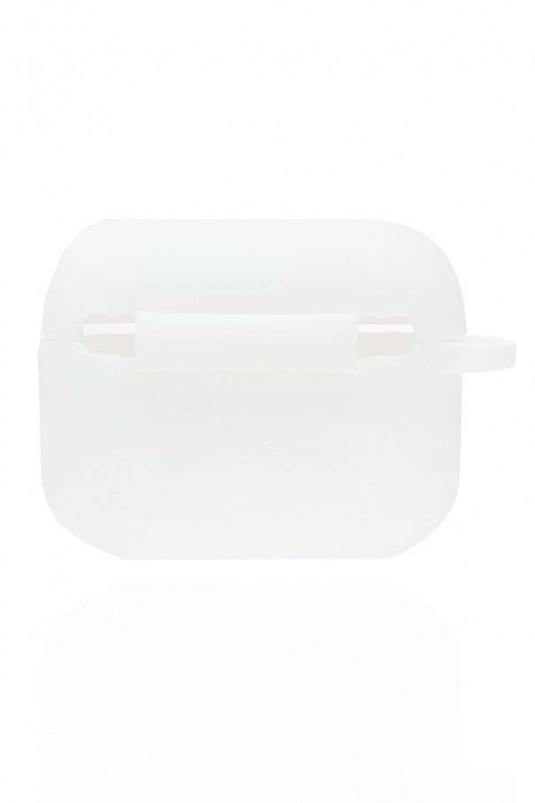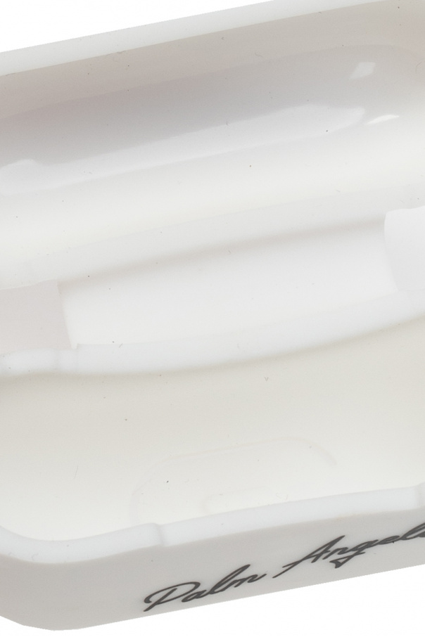 White AirPods Pro case from Palm Angels. Printed with the brand's logo in black, this item features silver-tone metal hardware, a strap and a keyring.