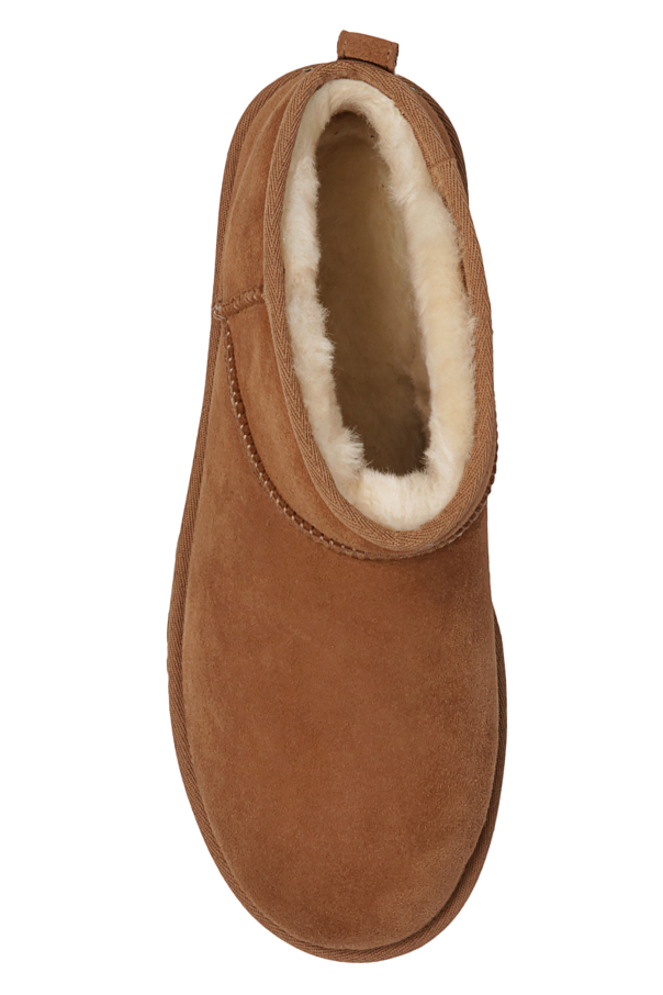 Light brown ‘Classic Ultra Mini’ snow boots from UGG. Crafted from Twinface sheep leather, this model features a back logo patch, textile binding made from 100% recycled polyester fibers, a beige UGGplush™ insole and a beige Treadlite by UGG™ EVA foam outsole.