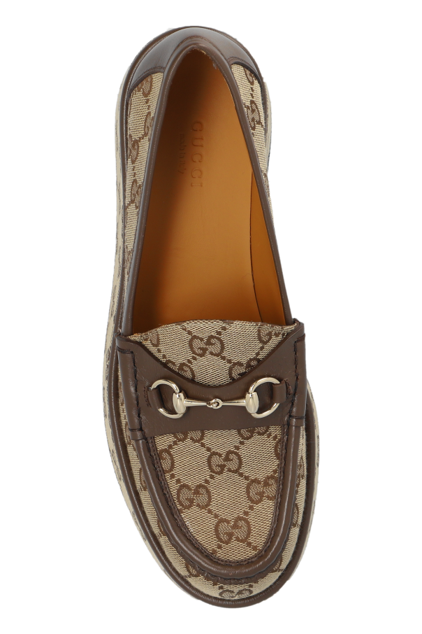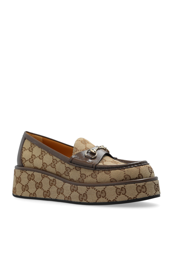 Introducing the Platform Loafers by the esteemed designer Gucci. This exquisite footwear embodies a harmonious blend of classic elegance and contemporary flair, making it a quintessential addition to any discerning wardrobe. Expertly crafted from premium materials, these loafers feature a sophisticated monogram "GG" pattern, seamlessly woven into high-quality fabric. The leather accents, prominently displayed on the toe, heel, and around the upper shaft, enhance the overall luxurious appeal. The dominant hues of beige and brown create a timeless color palette, ensuring versatility and refinement. A striking metal bit detail adorns the front, a signature of the designer's distinguished style. The interior, lined with sumptuous brown leather, offers unparalleled comfort, while the elevated platform sole provides a modern twist on a classic silhouette. Further elevating the design, leather inserts in a darker brown shade accentuate the heel and upper trim. Why Choose This Product? Designed by the renowned Gucci, under the visionary direction of Alessandro Michele. Combines classic loafer design with a modern platform sole. Features the iconic monogram "GG" pattern and metal bit detail. Constructed with high-quality leather exterior and interior for durability and comfort. Versatile beige and brown color scheme suitable for various outfits.