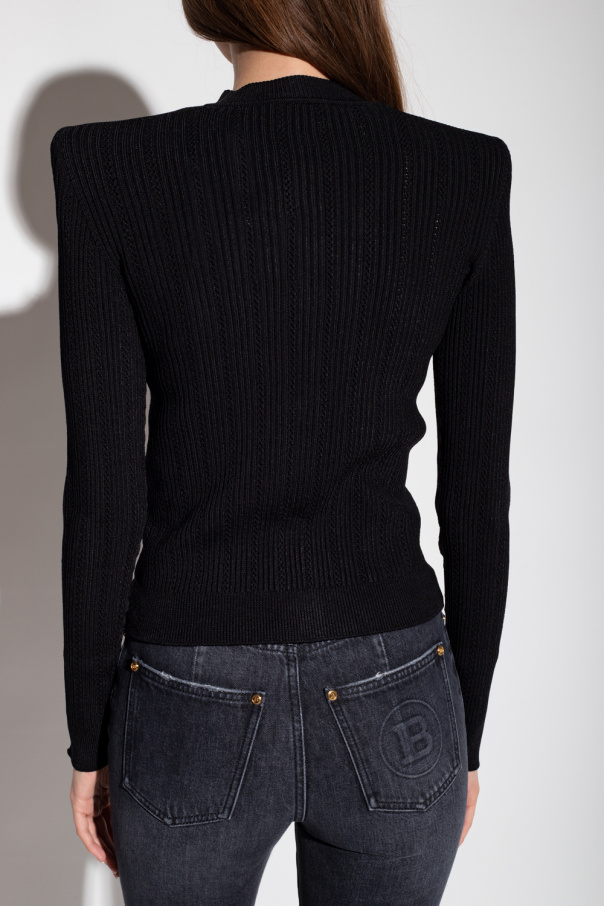 Black knitted cardigan from Balmain. Accentuated with padded shoulders, this style features snap fastenings, a round neck, long sleeves and four snap-fastened pockets on the front (two of them are decorative ones).
