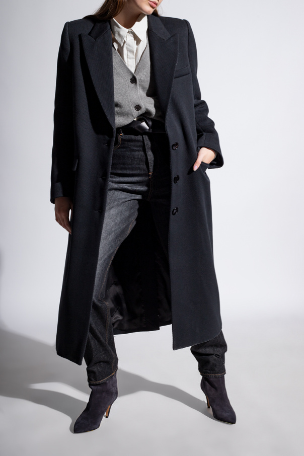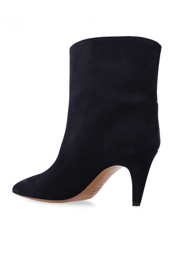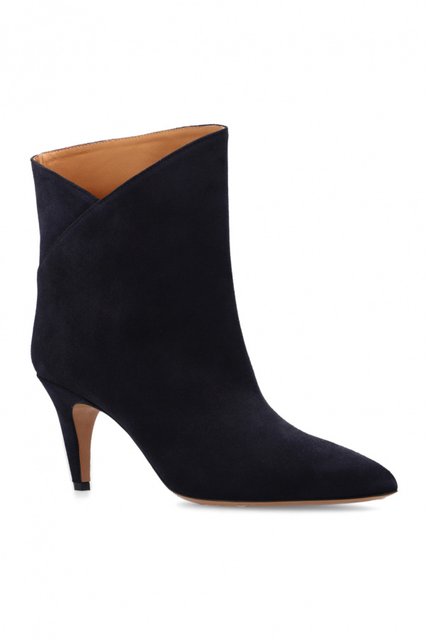 Dark navy ‘Delf’ heeled ankle boots from Isabel Marant. Resting on a light brown leather sole, this pair has an asymmetrical suede upper.