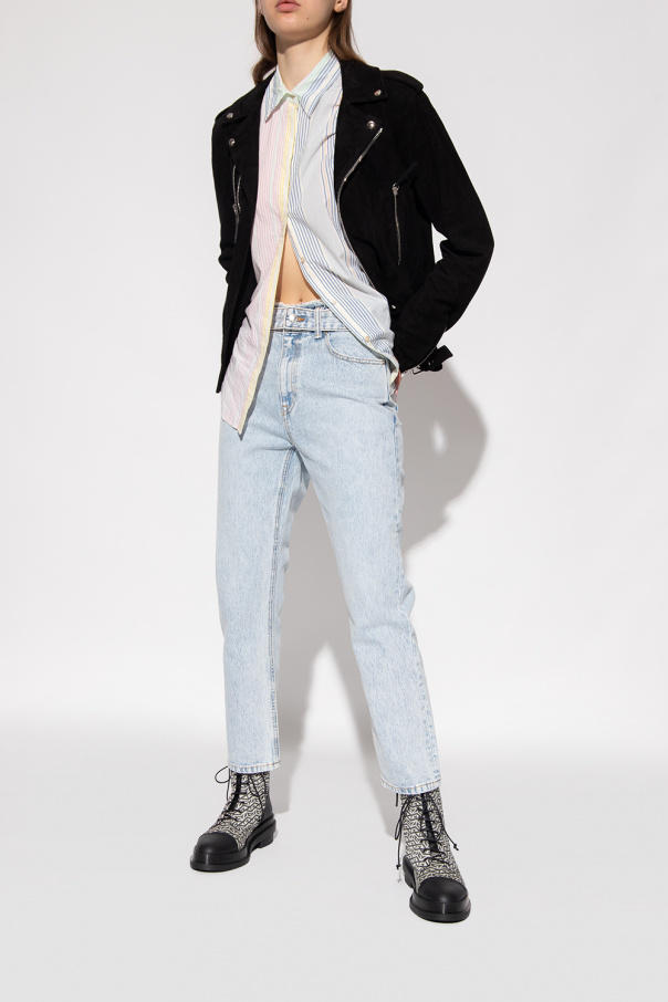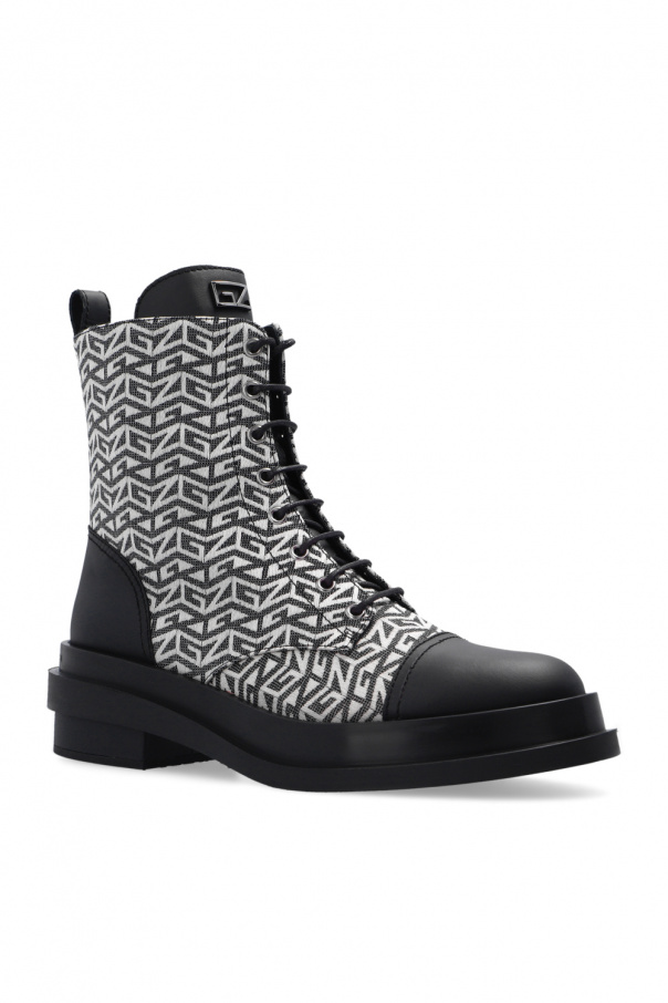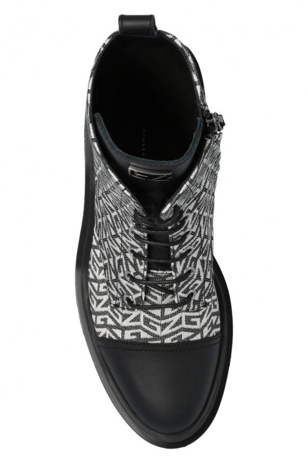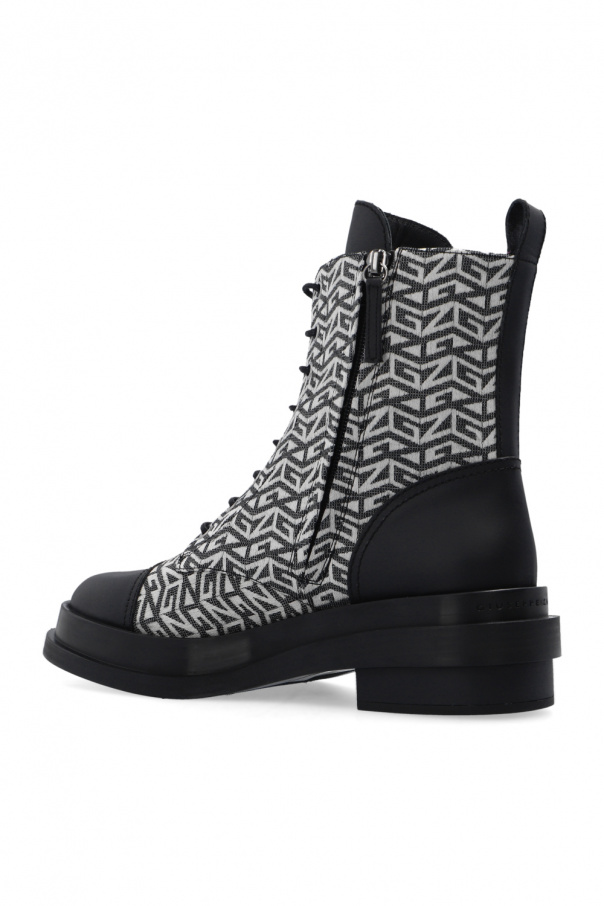 White and black ‘Malick Monogram’ combat boots from Giuseppe Zanotti. Crafted from leather and jacquard fabric with a monogram motif, this lace-up model features a side zip fastening and a black rubber sole.