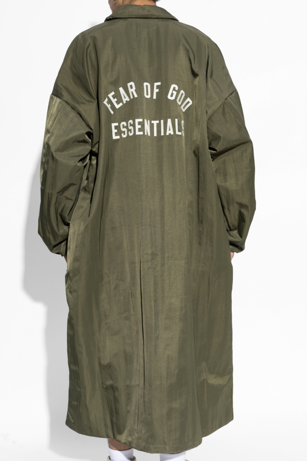 Introducing the Fear Of God Essentials Coat with Collar, a hallmark of refined elegance from the acclaimed designer Jerry Lorenzo. This long, straight-cut coat, extending gracefully below the knees, captures the essence of sophisticated casual wear. Crafted from lightweight, recycled nylon, this coat boasts a subtle sheen that suggests both water-resistant and windproof qualities. The olive green hue exudes a timeless appeal, making it a versatile addition to any wardrobe. The coat features a classic, straightforward collar and long, wide sleeves that lend an effortlessly oversized look. It is secured with a front zipper, ensuring practicality without compromising on style. The back of the coat is adorned with a large, textured embroidery of "FEAR OF GOD" and "ESSENTIALS" in striking white, underscoring its premium brand identity. Designed with a loose, comfortable fit, this coat is perfect for everyday, relaxed wear, as showcased in the model images paired with shorts and a white T-shirt. Additionally, it includes two convenient pockets for added functionality. Why Choose This Product? Premium Material: Made from 100% recycled nylon. Exclusive Branding: Features distinctive "FEAR OF GOD" and "ESSENTIALS" embroidery. Versatile Design: Olive green color and oversized fit suitable for casual wear. Functional Details: Includes a front zipper and two pockets. Eco-Friendly: Crafted from recycled materials.