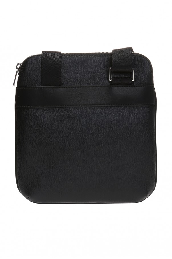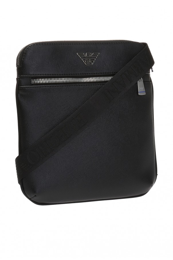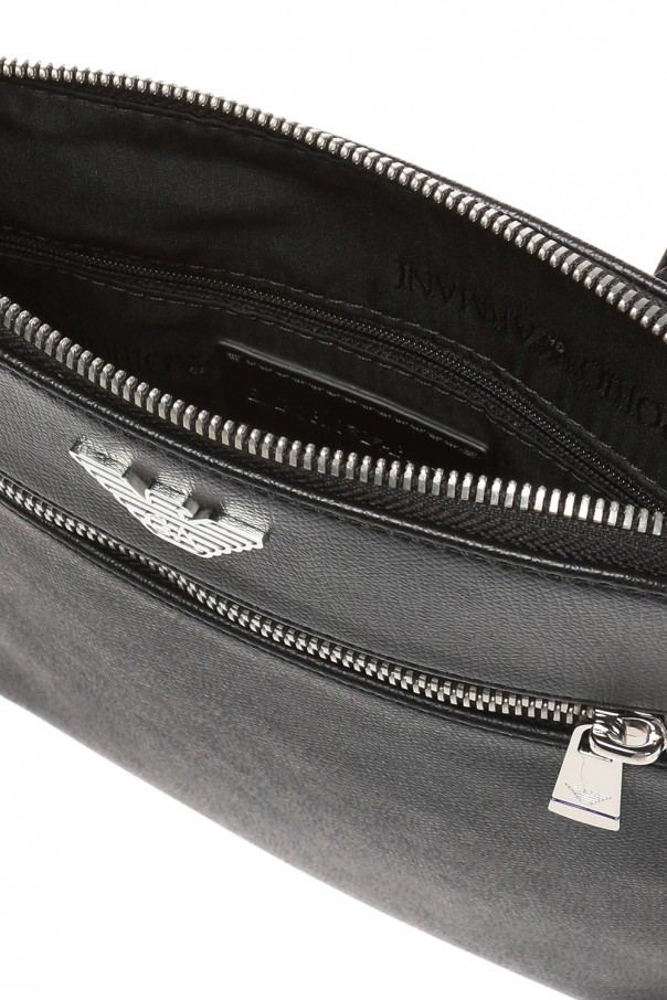 Black shoulder bag from Emporio Armani. Made of eco-leather with a texture. Fastened with zip. Metal logo application and zip pocket at front. Shoulder strap features embroidered logo. Interior has 1 compartment, 1 slip pocket and 1 zip pocket. Silver-tone metal hardware.