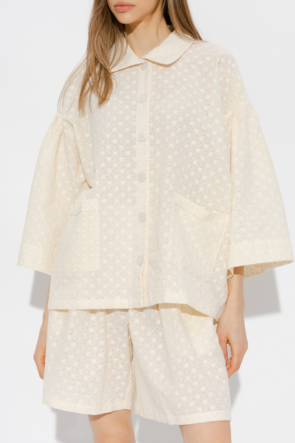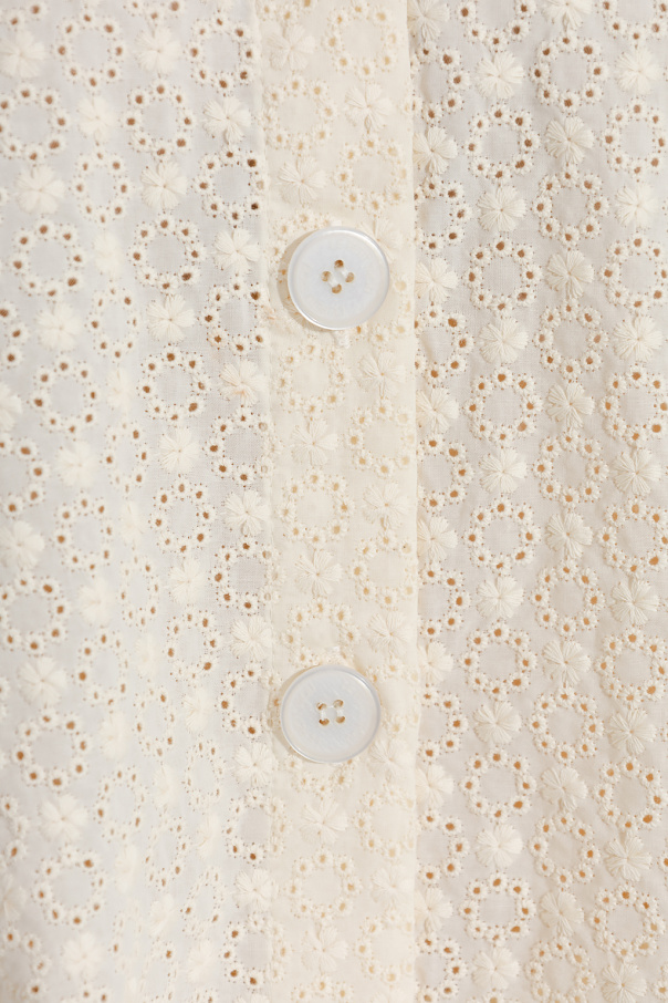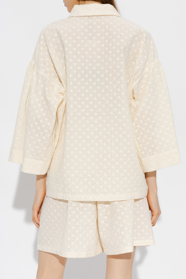 Cream ‘Kyla’ shirt from Le Petit Trou. Made of cotton with an openwork design, this style showcases a floral pattern, button fastenings, two slip pockets and wide sleeves.