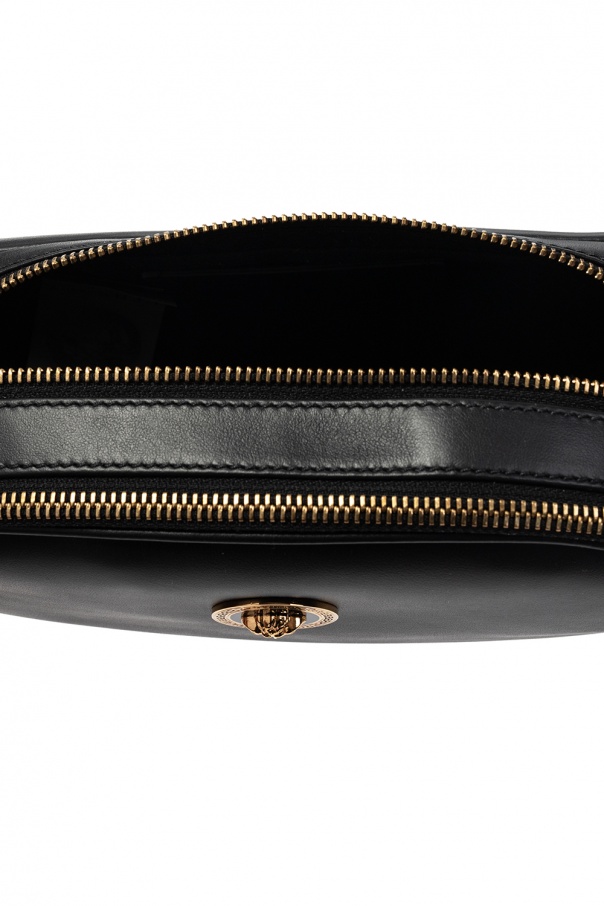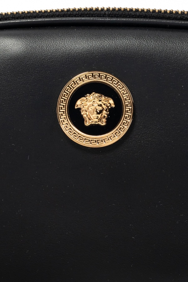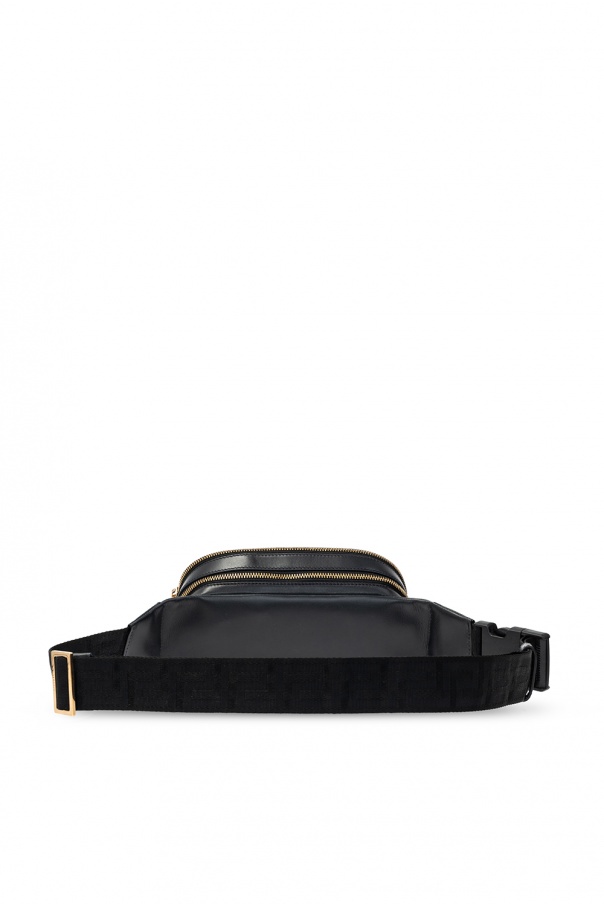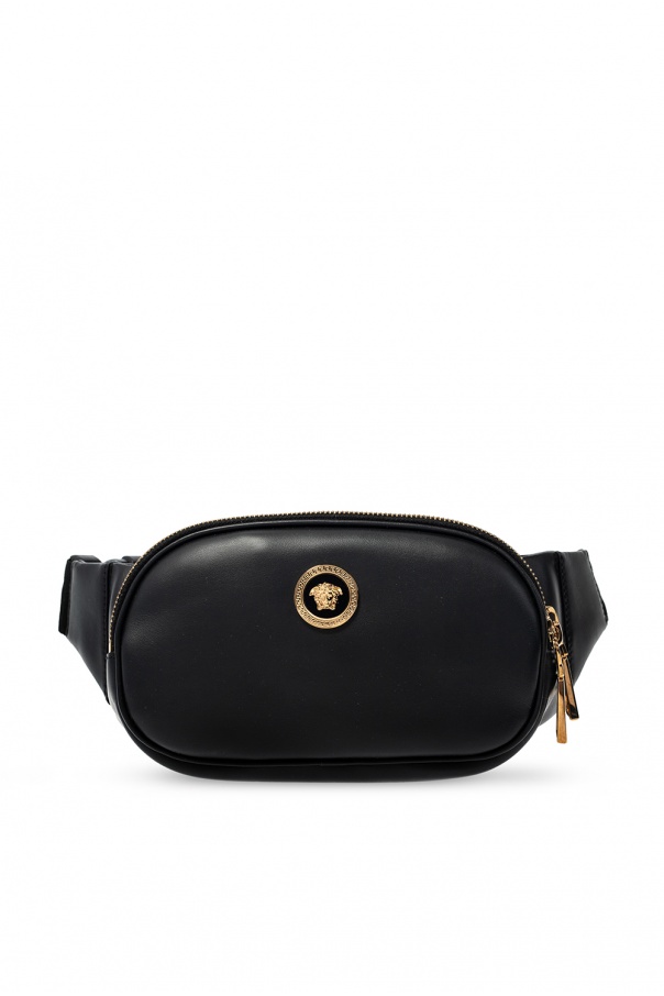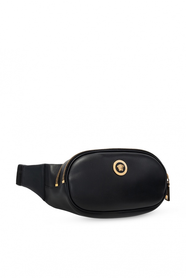 Black belt bag from Versace. Spruced up with gold-tone hardware wielding the brand's iconic Medusa and Greca motifs, this calf leather-crafted design fastens via two zippers and employs an adjustable strap and two internal compartments.