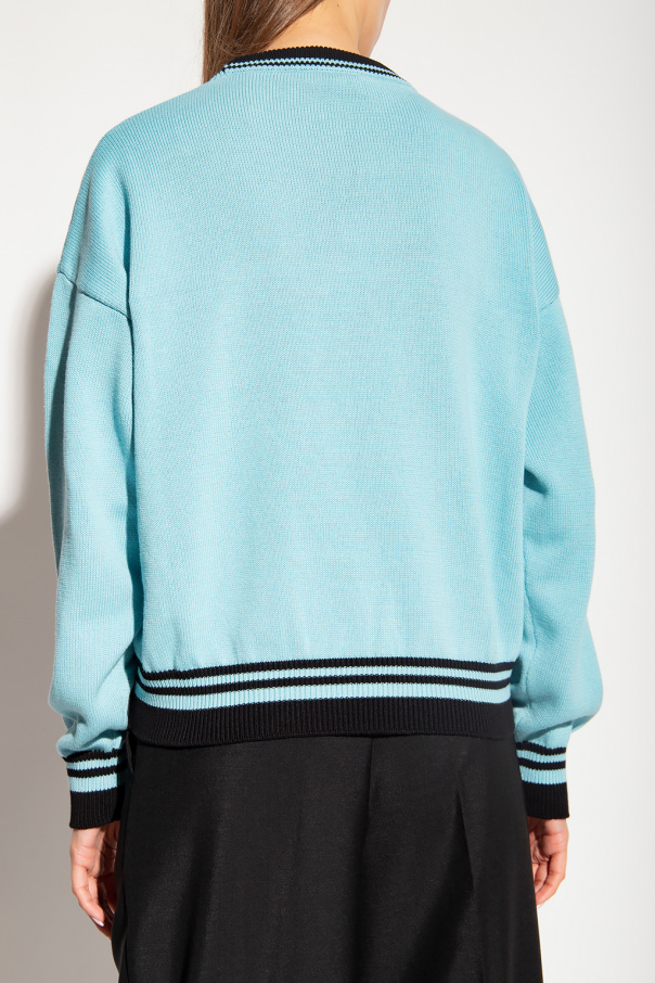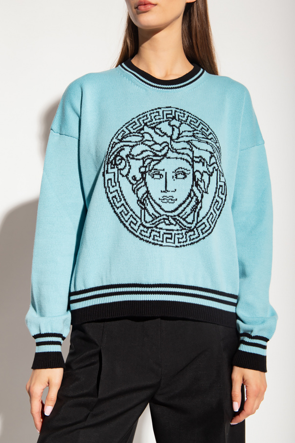 Light blue sweater from Versace. Made of cotton, this garment is decorated with the label’s signature Medusa head embroidery in black and ribbed trims at the crew neck, hem and cuffs.