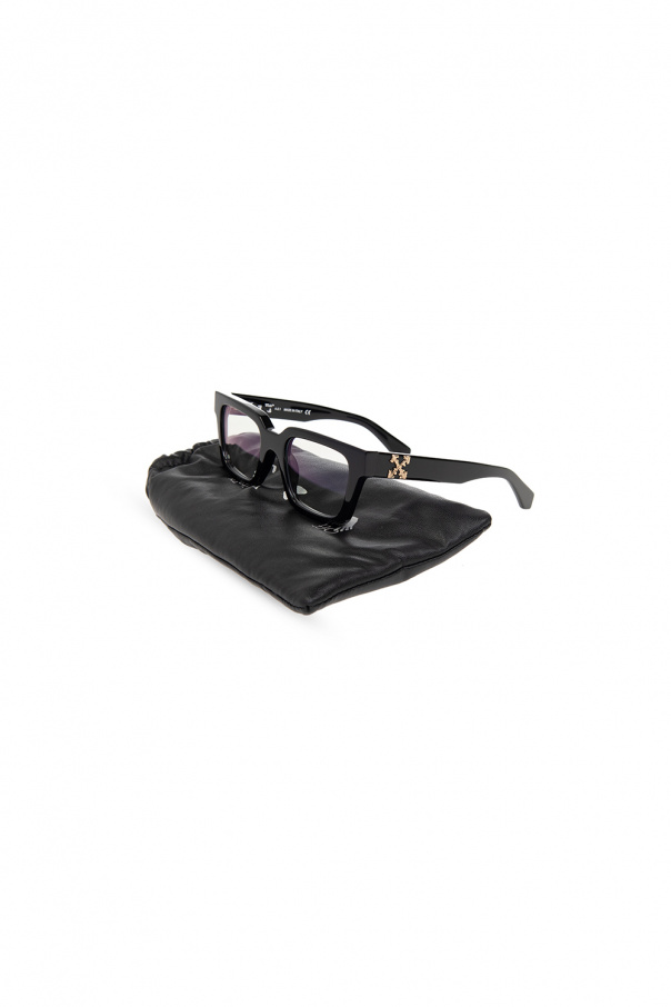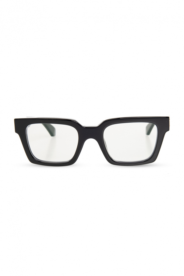Black ‘Style 1’ optical glasses from Off-White. This square frame pair features a raised logo in gold-tone and clear lenses with a blue light filter. Case included.