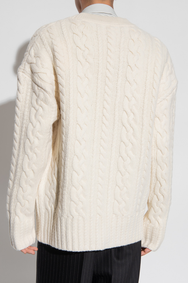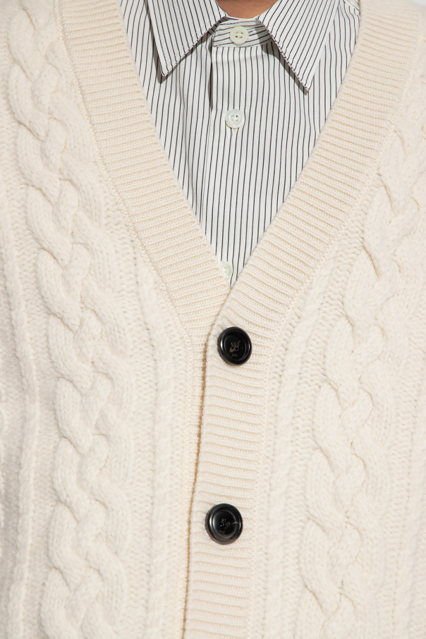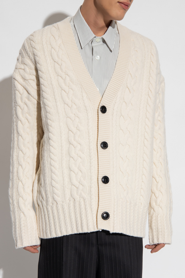 Cream cardigan from Ami Alexandre Mattiussi. Crafted from virgin wool, this V-neck design features button fastenings, decorative thick knit and ribbed trims at the hem and cuffs.