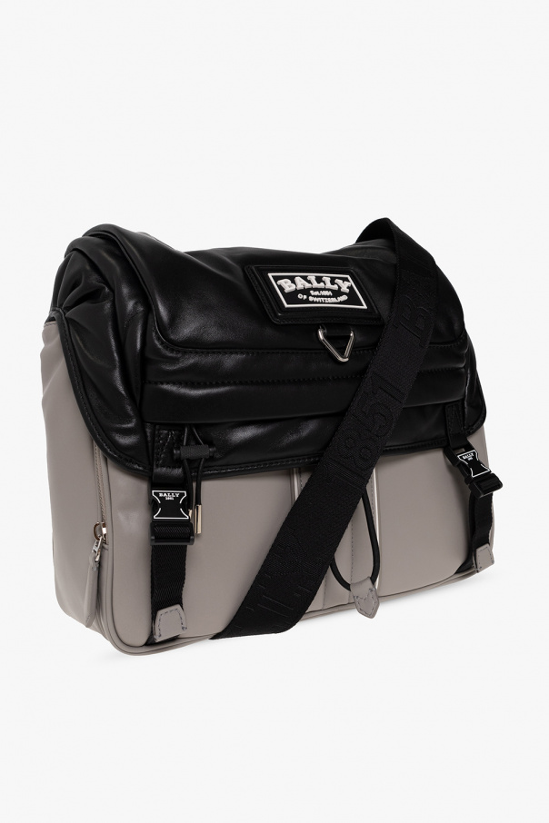 Black and grey ‘Adil’ shoulder bag from Bally. Crafted from leather, this design secures with snaps and showcases a white and black logo patch, a zip pocket on the front, an adjustable shoulder strap, silver-tone metal hardware and one internal compartment with one zip pocket and two slip pockets.