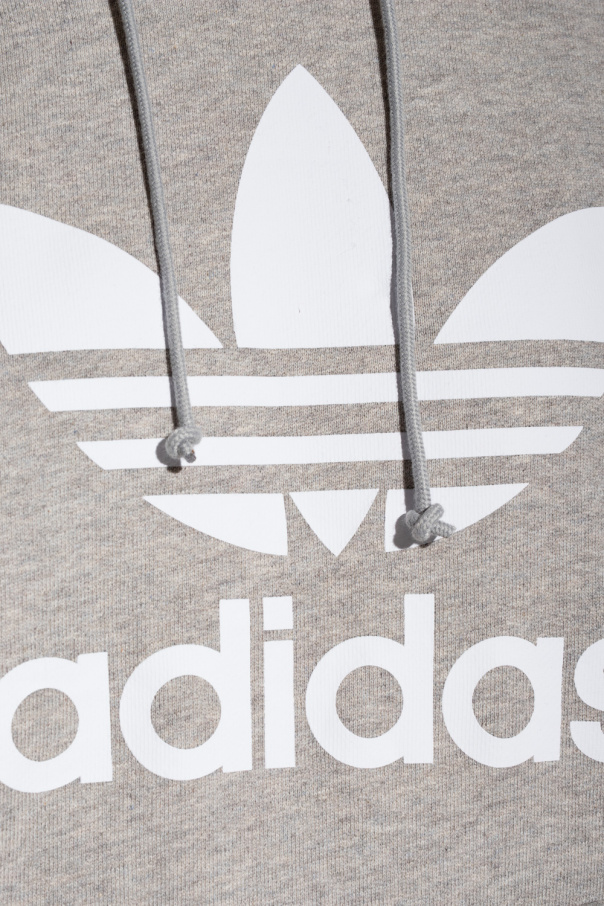 Grey sweatshirt with a drawcord-adjustable hood from ADIDAS Originals. Crafted from cotton jersey, this style showcases a white graphic print with the brand's logo, a kangaroo pocket and ribbed bottom hem and cuffs.