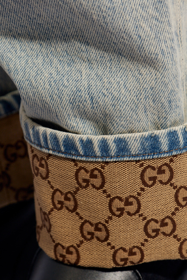 Blueish-beige jeans from Gucci. Made from cotton, this pair features a zip fly with a button, classic five-slip pockets, turn-up hems with a monogram-embroidered lining and a beige patch with an embossed logo on the back.