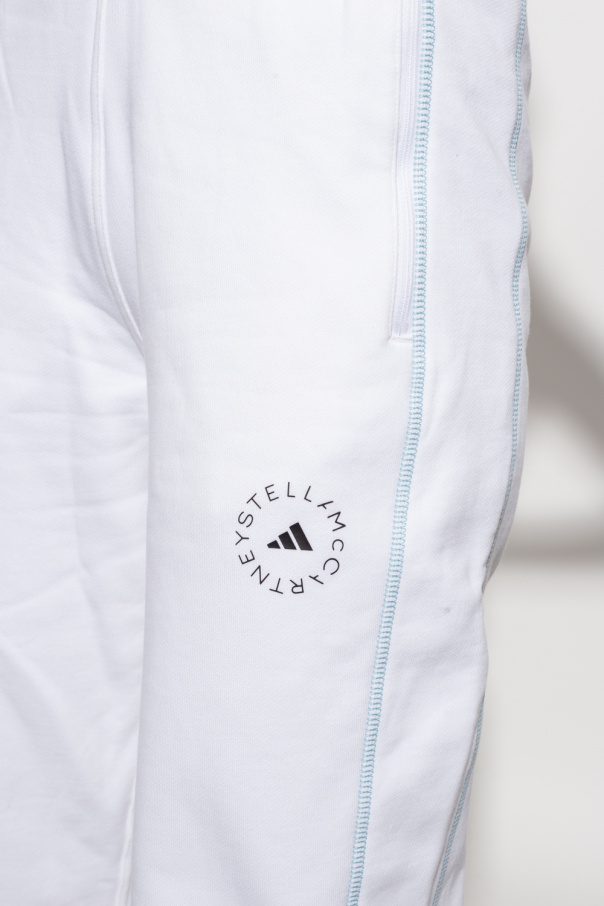 White cropped sweatpants from ADIDAS by Stella McCartney. Made of cotton from sustainable sources, this pair is complete with an elastic waistband with drawstrings, black logo embroidery, two slip pockets and ribbed cuffs.