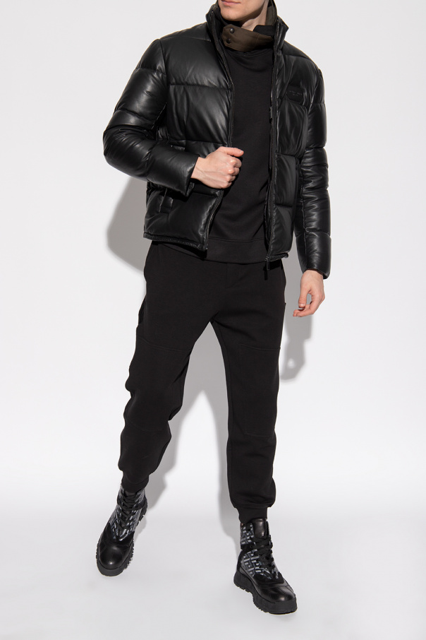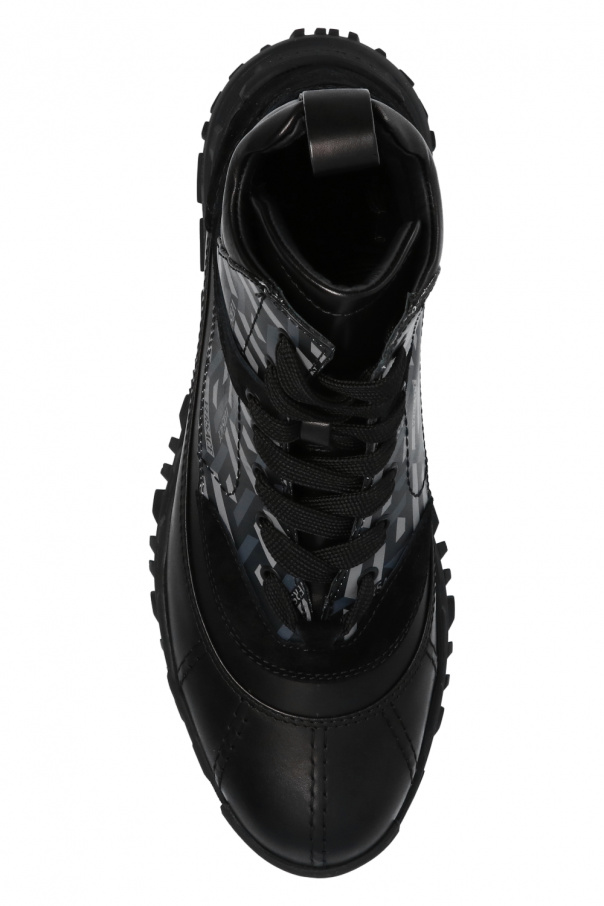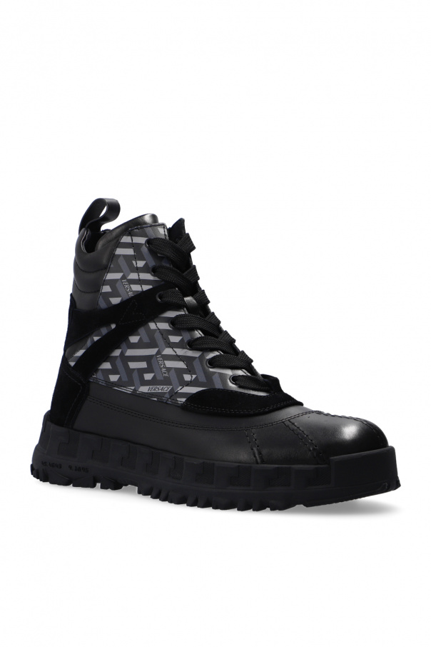 Black and grey lace-up ankle boots from Versace. Crafted from leather, this model features a logo pattern, almond toe and black rubber sole.