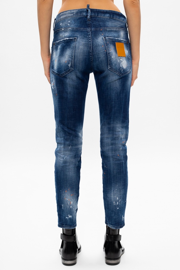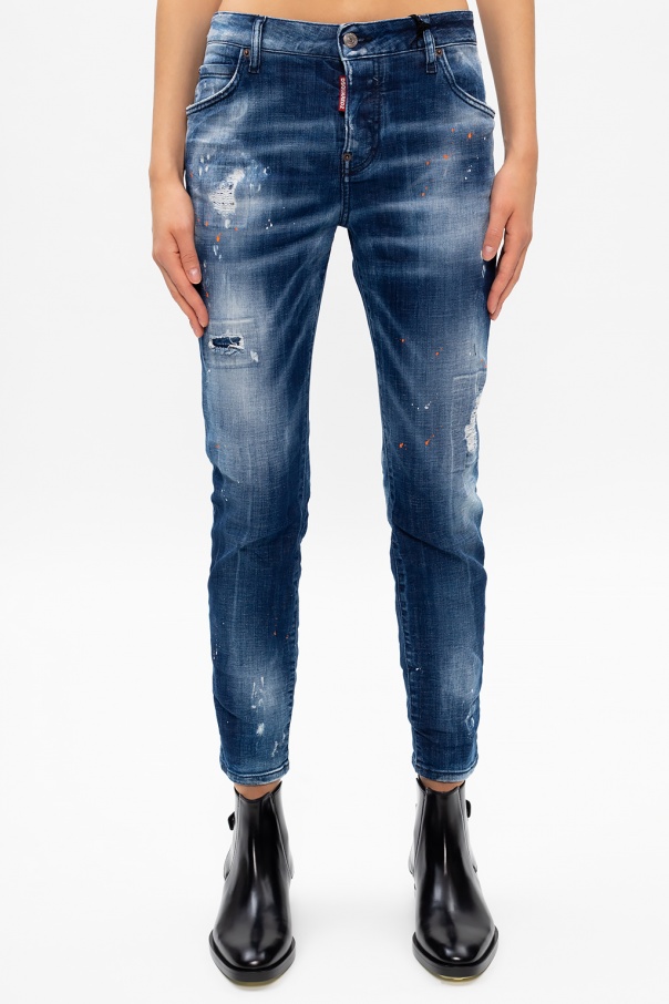Navy blue and blue ‘Cool Girl Jean’ jeans from Dsquared2. Showing off label's signature stonewashed effects and paint splatters, this pair comes with button closing, 5-pocket design, a logo-embossed patch on the back pocket and cropped legs.