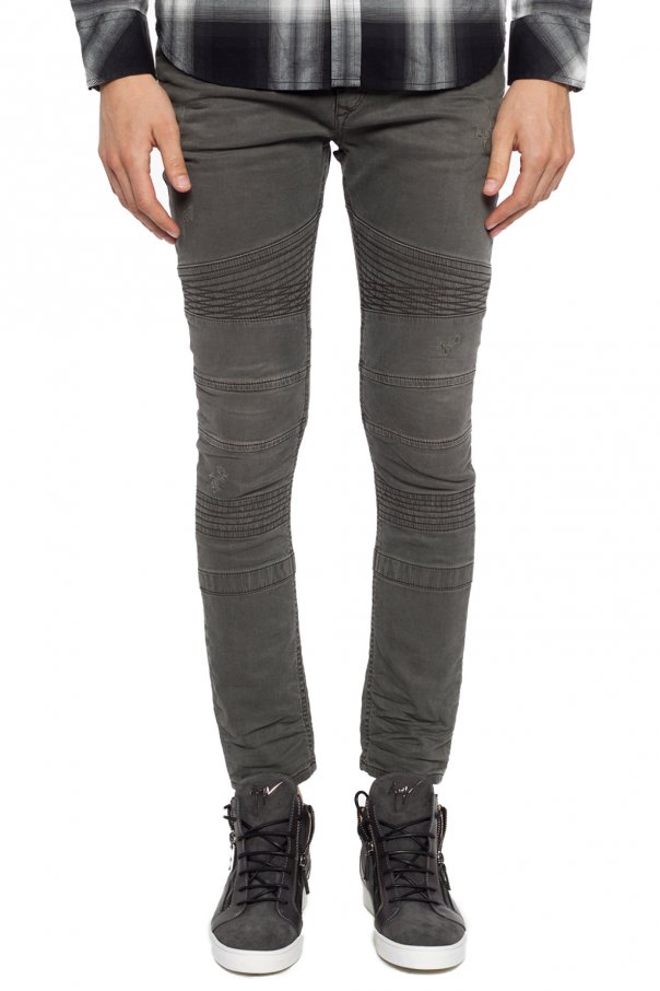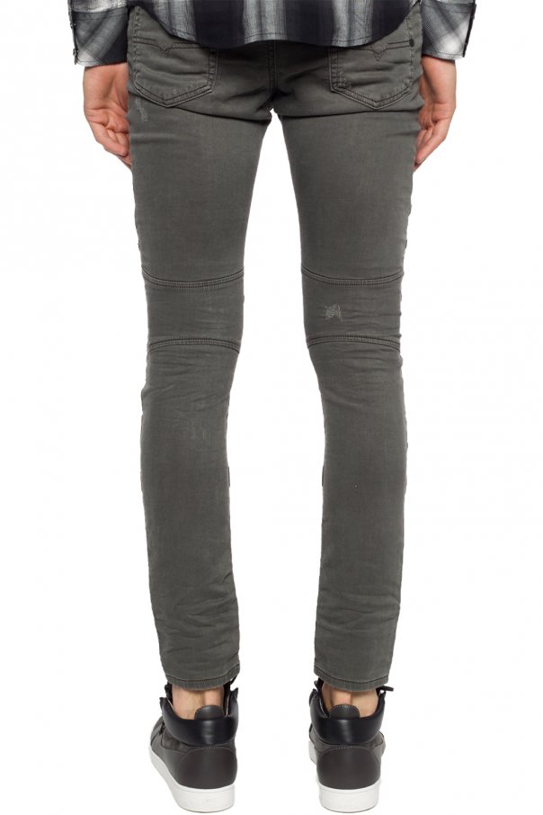 Grey 'Bakari-Ne' jeans from Diesel. Drawstring waist. Zip and button fastenings. 4 slip pockets. Grey stitching details. Tapered legs.